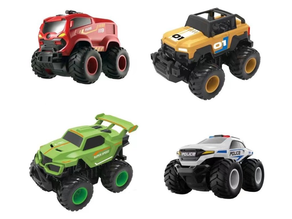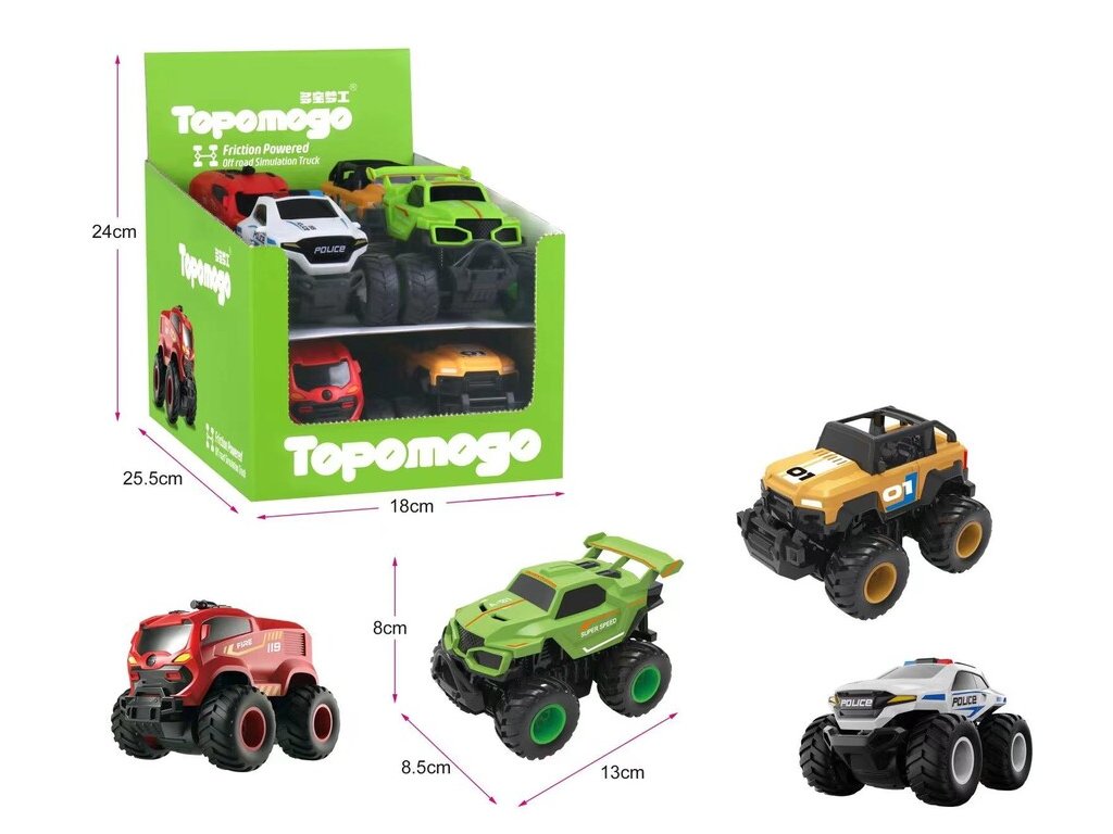 AutoAuto 4x4 na zotrvačník. Rozmery 13 x 8,5 x 8 cm. Materiál: plastUvedená cena je za 1 ksV prípade balenia obsah 8 ks4 varianty - hasičské, policajné, pretekárske, džíp