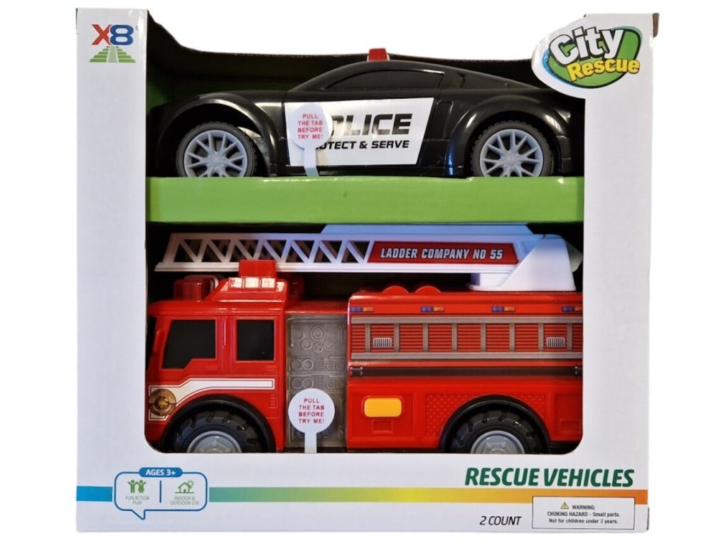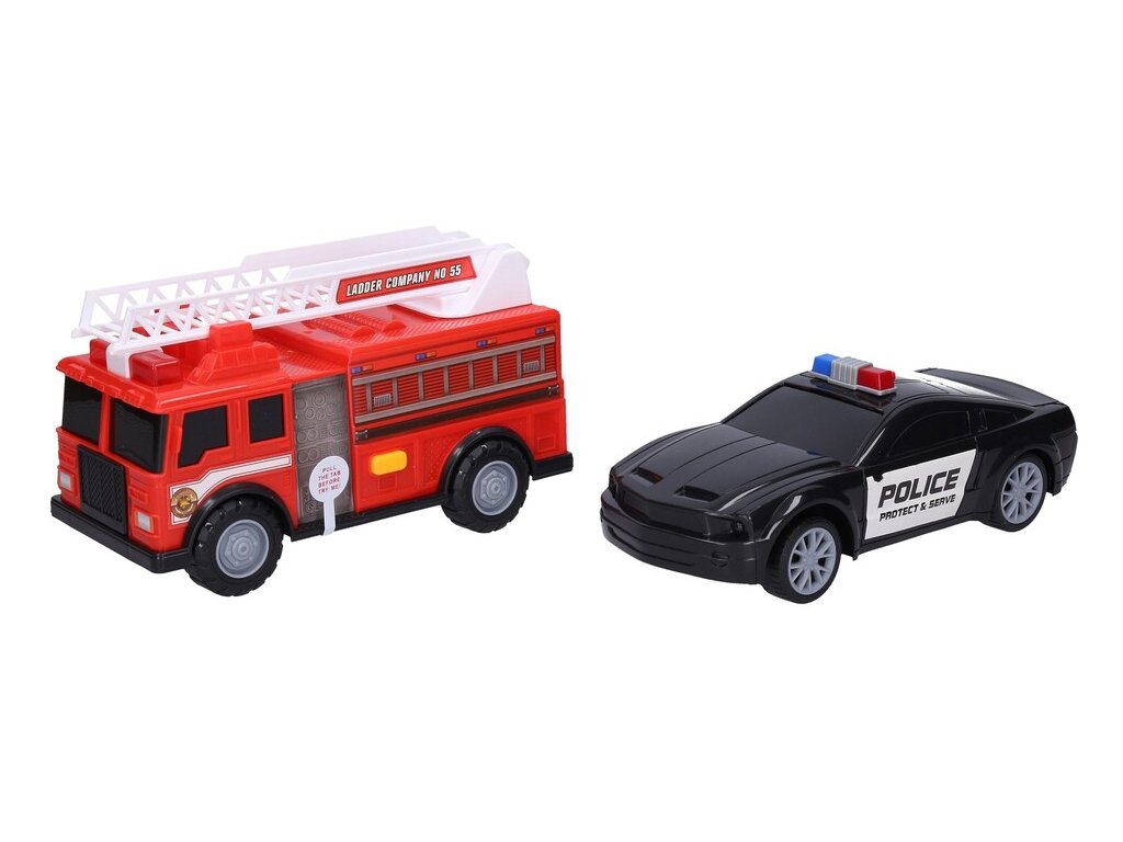 Auto policajné a hasičské s efektmiAutá policajné a hasičské s efektmi. Voľné kolesá. Svetelné a zvukové efekty tlačidlom na streche policajného auta a tlačidlom na ľavom boku hasičského auta. 2xAG13 batérie pre každé auto súčasťou. Veľkosť 23 cmZvukové a svetelné efektyBatérie súčasťou