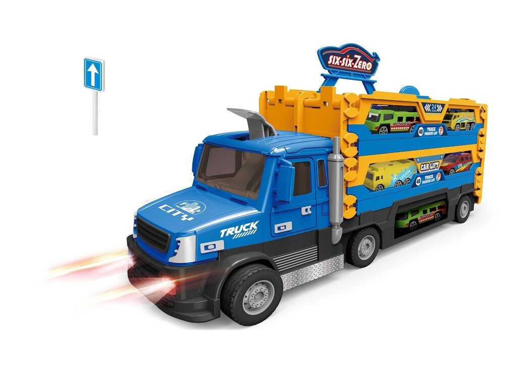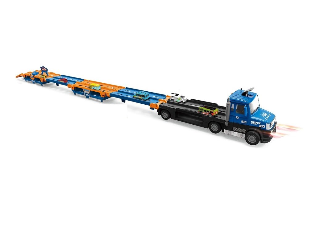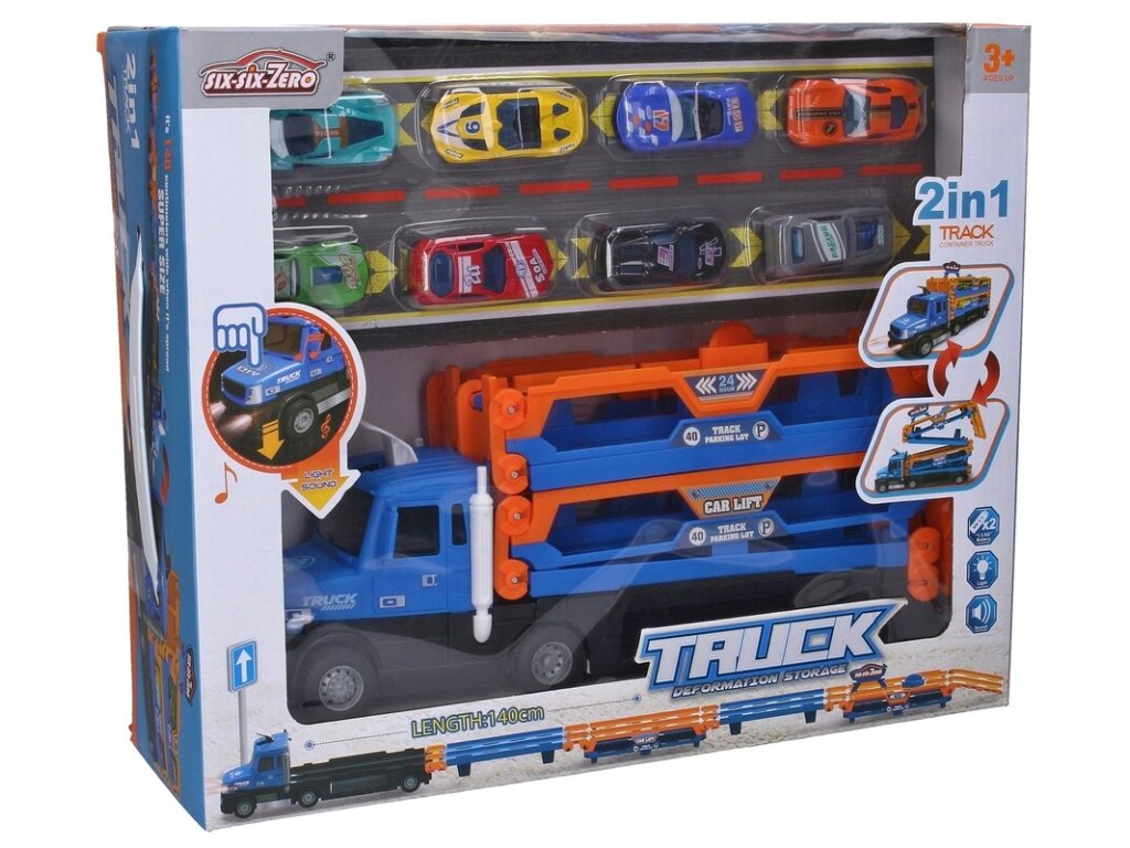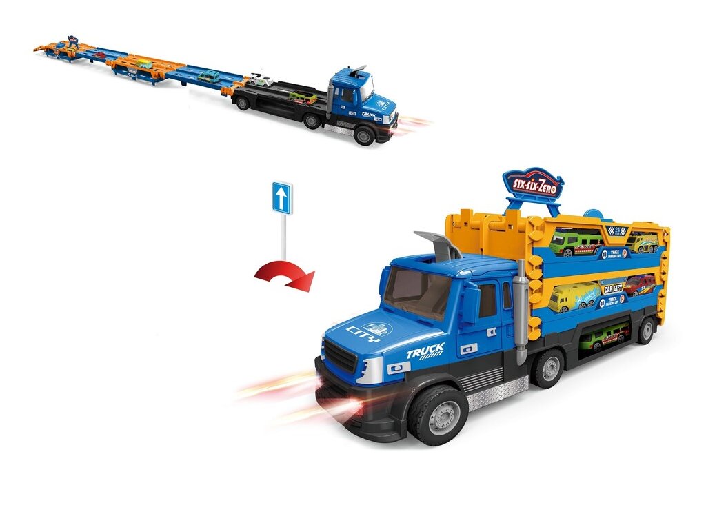 Auto ťahač s dráhou 140 cm 2v1Auto ťahač s vystreľovacou dráhou na autá a s kovovými autíčkami. Autíčka 6,5 cm dlhé majú voľné kolesá. Ťahač vydáva svetelné a zvukové efekty aktiváciou stlačením kapoty. Rýchla premena ťahača na vystreľovaciu dráhu. Rozmery zloženého ťahača 34 x 9,5 x 18 cmDĺžka vystreľovacej dráhy v rozloženom stave 140 cm Súčasťou balenia 8 autíčokNapájanie na batérie: 2x AA (nie sú súčasťou balenia)