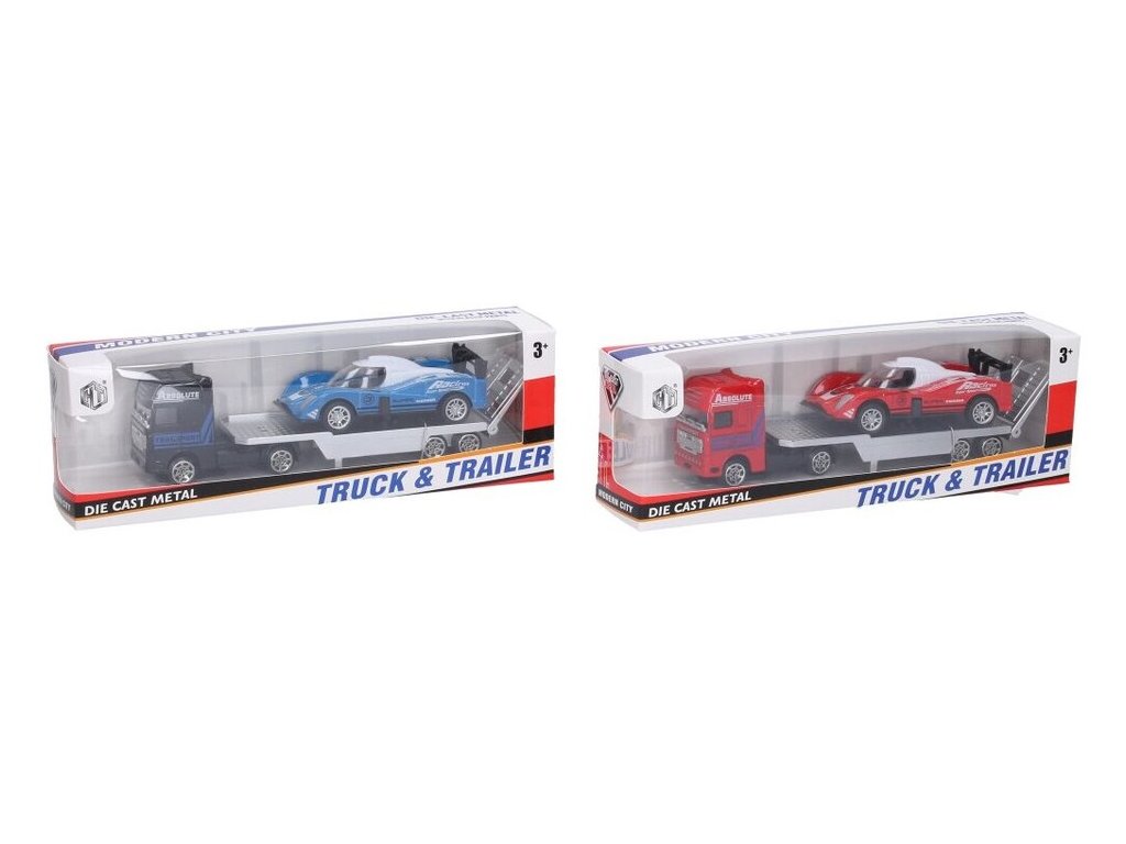 Auto ťahač so závodným autom 18,5 cm Materiál kovVoľné kolesáFarba závodného auta: biela, žltá, modrá, červená Rozmery: 18,5x4x4,5 cm