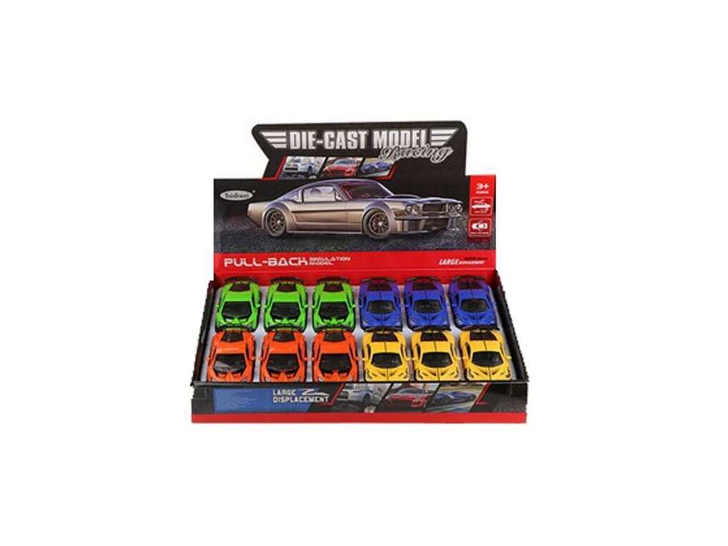 Auto závodné na spätné natiahnutie 12cmKovové závodné autíčko na spätné natiahnutie. Otváracie predné dvere. Farby: modrá, oranžová, zelená, žltáVeľkosť: 12 x 5 cmUvedená cena je za 1 ksV prípade celého balenia 12kusov