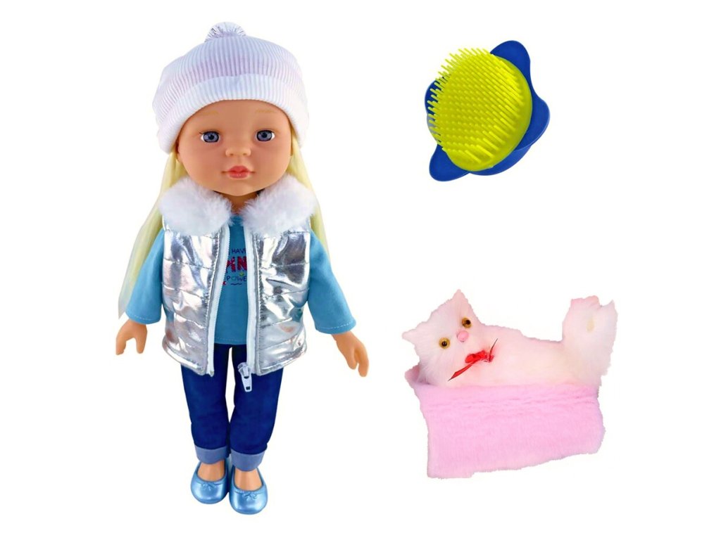 Bábika s mačkouKrásna bábika v zimnom oblečení a v čiapke. Súčasťou balenia je hrebeň na vlasy a domáci miláčik biela mačička. Veľkosť bábiky: 43 cmVhodná od 3+