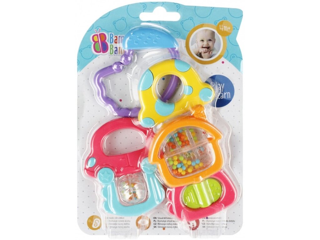 BamBam Hrkálka/hryzadlo 4ksHrkálka 4 v 1 je určená pre bábätká od 4 mesiacov. Vďaka jemným, žiarivým farbám, rôznym textúram materiálov a rozmanitému tvaru obsahuje interaktívne prvky, ktoré podporujú hru a zároveň stimulujú rozvoj zraku, sluchu a motorických zručností detí.Klip umožňuje jednoduché zavesenie na kočík alebo detskú postieľku. Vhodné pre deti od 4m+