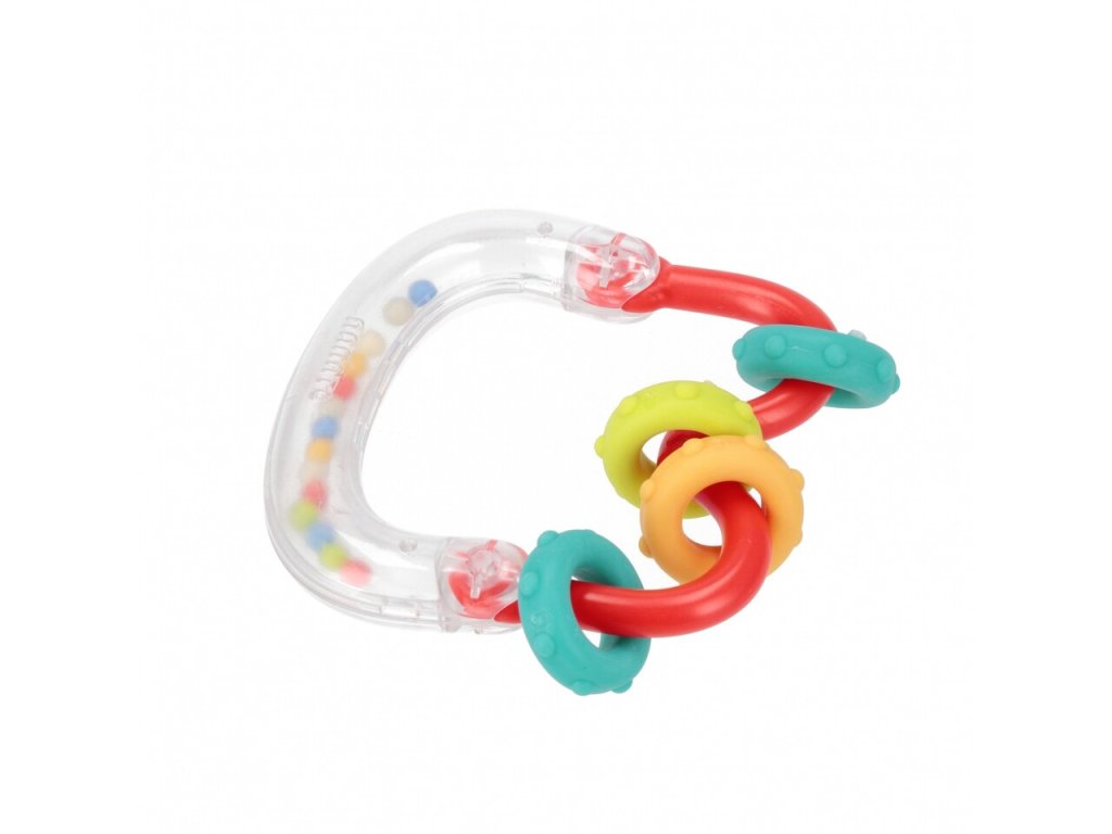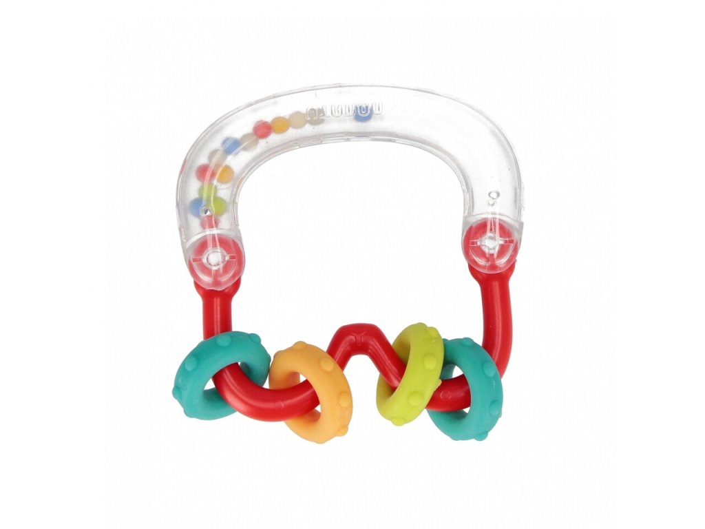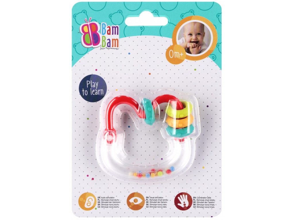 BamBam Hrkálka / hryzadlo Špirálová hračka určená pre bábätká od narodenia. Vďaka žiarivým farbám, rôznym textúram materiálov a rôznym tvarom obsahuje interaktívne prvky, ktoré podporujú hru a stimulujú rozvoj zrakových, sluchových a motorických zručností. Rukoväte zaisťujú, že hrkálka/hryzátko sa ľahko uchopí a drží v malých rúčkach. Ďalšie funkcie, ako sú rotujúce guľôčky vo vnútri hračky a krúžky na okrajoch, vylepšujú hru a zároveň podporujú rozvoj manuálnych a jemných motorických zručností. Rozmery výrobku: 8 x 7 x 3 cmHračka je určená pre deti od 0m+