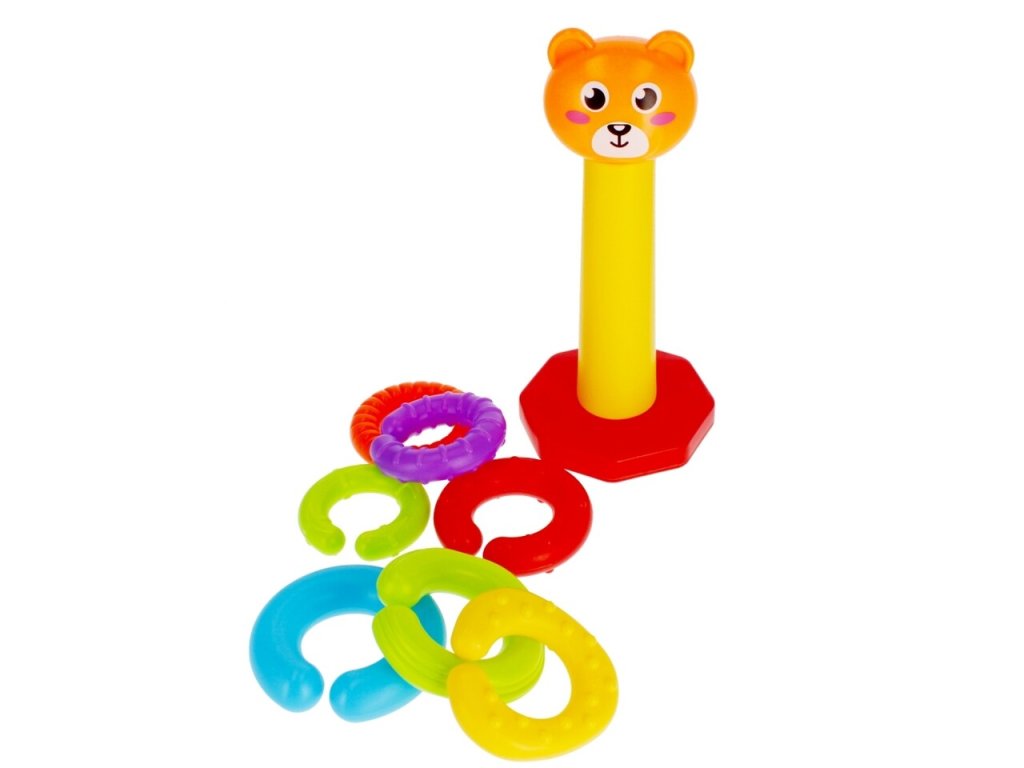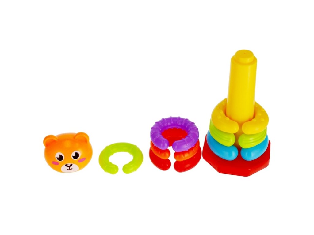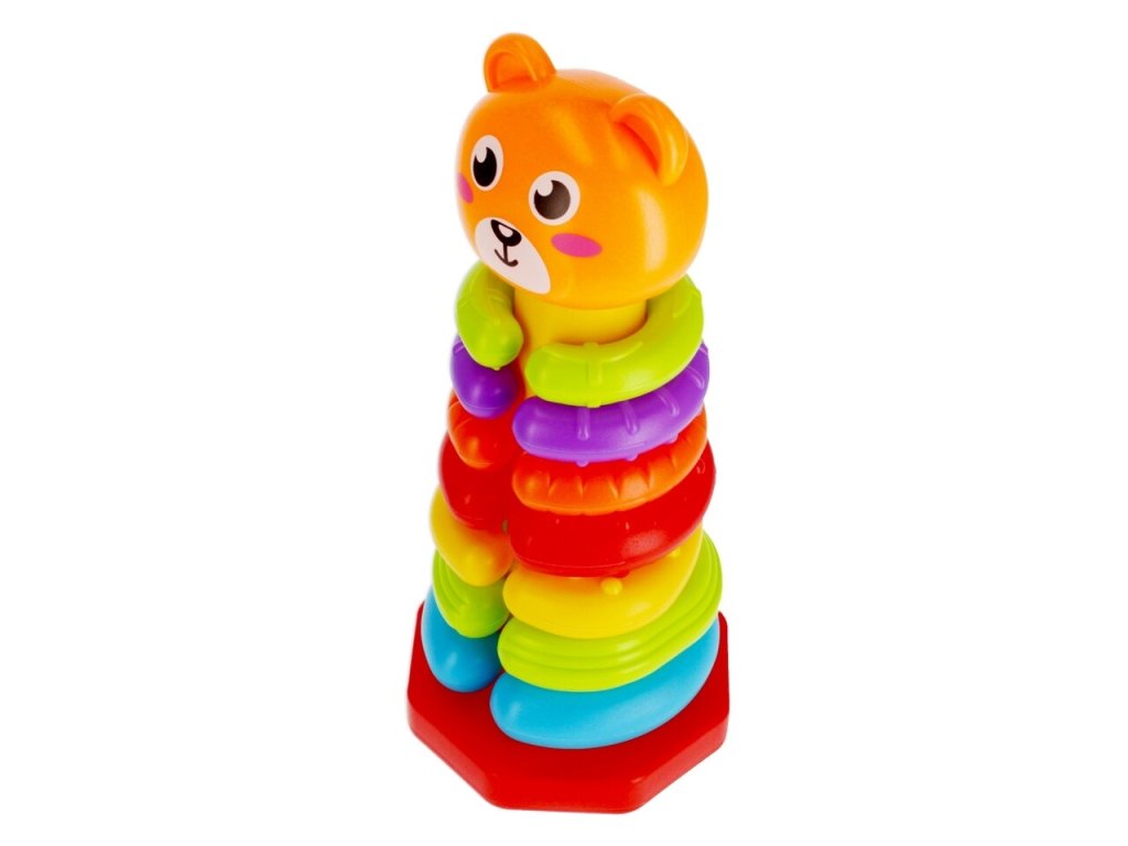 BamBam Pyramída farebný medveď Dúhovo sfarbené krúžky medvedíka sú ideálne pre prvé fázy učenia sa triedenia a rozvoja jemnej motoriky. Skladanie krúžkov na seba a ich následné trasenie poskytuje vášmu dieťaťu veľa zábavy a povzbudzuje k akcii. Rôzne textúry a nepravidelné povrchy krúžkov ďalej umocňujú hmatový zážitok a zintenzívňujú ich hmat. Živé farby prvkov a ich rozmanité textúry stimulujú zmysly na mnohých úrovniach vrátane zraku a vnímania. Táto hračka dokonale rozvíja predstavivosť a kognitívne schopnosti. Rozmery: 12 x 29 x 12 cmUrčené pre deti od 6 mesiacov