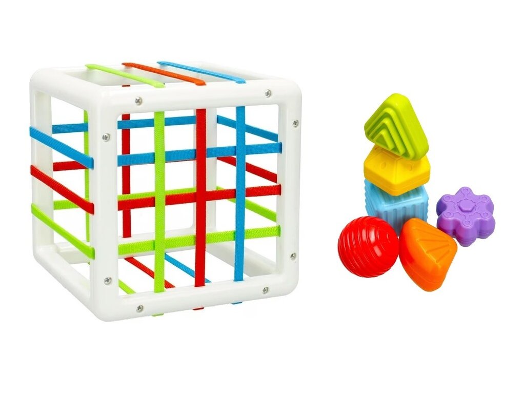 BamBam Vkladačka senzorickáTáto výnimočná hračka vytvára takmer neobmedzené možnosti hry a zároveň rozvíja kognitívne funkcie batoľaťa na mnohých úrovniach. Šesť kociek v krásnych, intenzívnych farbách s rôznou textúrou a štruktúrou je možné vhodiť do triediacich kociek a navzájom ich rôzne kombinovať.Vnútro kociek je vyplnené pohyblivými časťami, vďaka ktorým je každý pohyb sprevádzaný zvukom hrkálky . Manipulácia s nimi, hádzanie, aranžovanie a spájanie pomáha zlepšovať jemnú motoriku, manipulačné schopnosti, ale aj sústredenie, pochopenie vzťahu pohybu oko-ruka .Triedič pripevnený k blokom, ktorých steny sú vypletené z farebných gumičiek, dokonale plní funkciu triedičky a boxu na hračky a podpery na ďalšie príslušenstvo . Na okraje môžete pripevniť 2 obruče s navlečenými korálkami na precvičenie malých prstov pohybom. Okrem okrajov môžete na okraje umiestniť aj veterník , v strede ktorého je figúrka šťastnej včely, ktorá sa točí okolo svojej osi. Krídla ventilátora sú vyplnené mäkkými, zmyslovými bublinami rôznych textúr. Na jednej strane sú vyrazené geometrické tvary a na opačnej strane čísla 5 až 7. Odporúčaný vek : 12m+