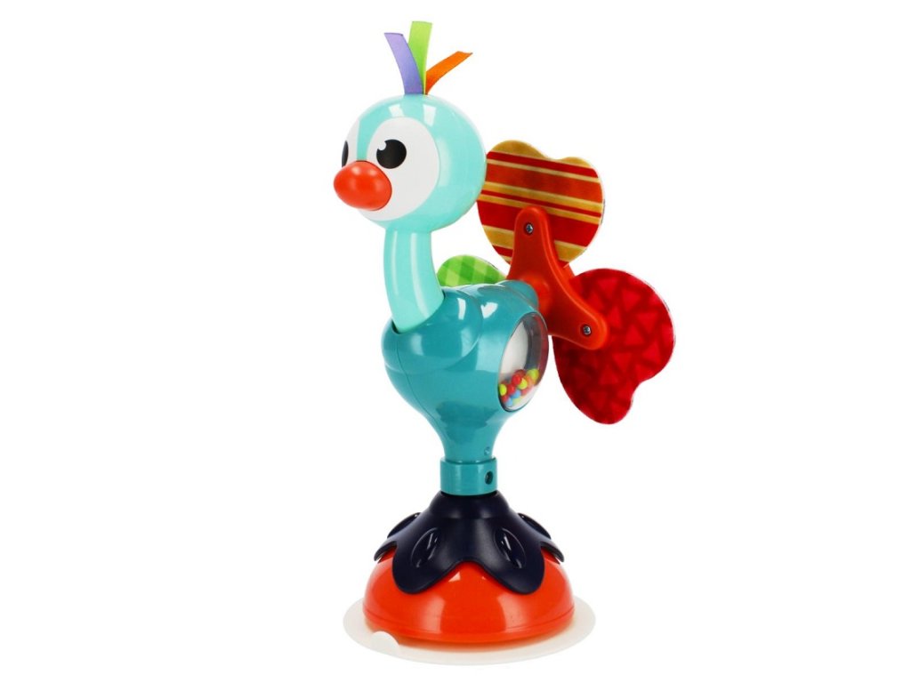 BamBam Vtáčik na prísavkeFigúrka milého vtáčika je osadená na otočnej dvojfarebnej platforme. Plošina v dôsledku otáčania vydáva jemné hrkajúce zvuky aj vďaka farebným guličkám umiestneným v brušku vtáka. Chvost vtáčika je vyrobený z 3 okvetných lístkov materiálu s rôznymi textúrami a vzormi, vrátane čiernej a bielej na jednej strane, ktoré pri otáčaní pohlcujú pozornosť dieťaťa, aktivujú jeho zrak, hmat a sluch . Ťahanie alebo otáčanie chvostovej vrtule mu umožňuje zlepšiť manuálne a motorické zručnosti . Prísavka umiestnená pod hračkou zaisťuje stabilné pripevnenie k doske stola, vozíka alebo stoličky na kŕmenie. Odporúčaný vek : 6m+