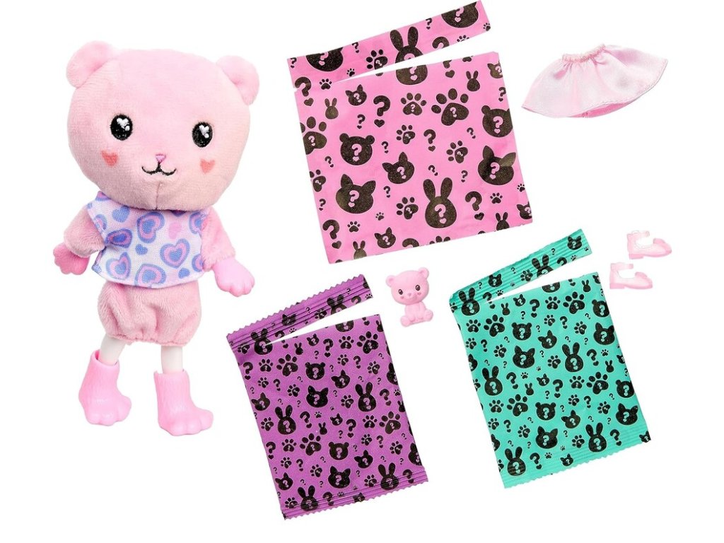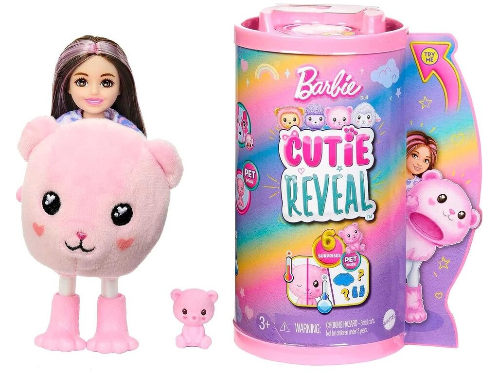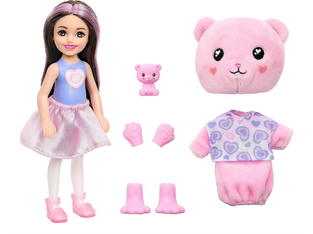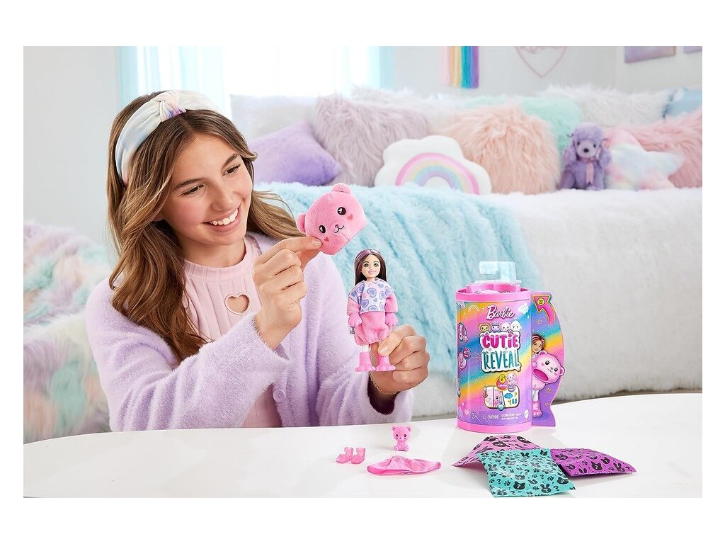 Barbie Cutie Reveal Chelsea Bruneta malá bábika s doplnakmiBábiky Barbie® Cutie Reveal™ Cozy Cute Tees™ série Chelsea™ ponúkajú ten najroztomilejší zážitok z rozbaľovania so šiestimi prekvapeniami. Odstráňte plyšový kostým a odhaľte bábiku Chelsea™ s ďalšími prekvapeniami, ako je saténová sukňa a mini zvieratko, ktoré ladí s kostýmom bábiky.Ľadová studená voda dodáva mini zvieratkám ešte viac roztomilosti s transformáciou farby. Deti budú milovať objavovanie prekvapení roztomilej sérii Barbie® Cutie Reveal™. Obsahuje bábiku v kostýme zvieratka a šesť prekvapení. Rozbaľte a nájdite plyšové ružové mláďa medvedíka v našitom tričku s bábikou Chelsea™ vo vnútri.Zdvihnite hlavu kostýmu a odhaľte malú bábiku Chelsea™ s dlhými ružovými melírovanými vlasmi a trblietavými detailmi tváre.Otvorte 3 vrecúška s prekvapením a nájdite módu a doplnky - ako saténová sukňa, pár topánok a rozkošný mini medvedík.Deti si môžu obliekať a upravovať bábiku Cutie Chelsea™ prehodením vrchného dielu kostýmu a nájsť super mäkkú flísovú bundu s roztomilou módnou potlačou.Použite ľadovo studenú vodu na „otvorenie“ a „zatvorenie“ očí mini medvedíka. Bábiky Chelsea™ Cutie Reveal™ Cozy Cute Tees™ zo série sú skvelým darčekom pre deti od 3 do 7 rokov, najmä pre tie, ktoré milujú objavovanie roztomilých prekvapení!