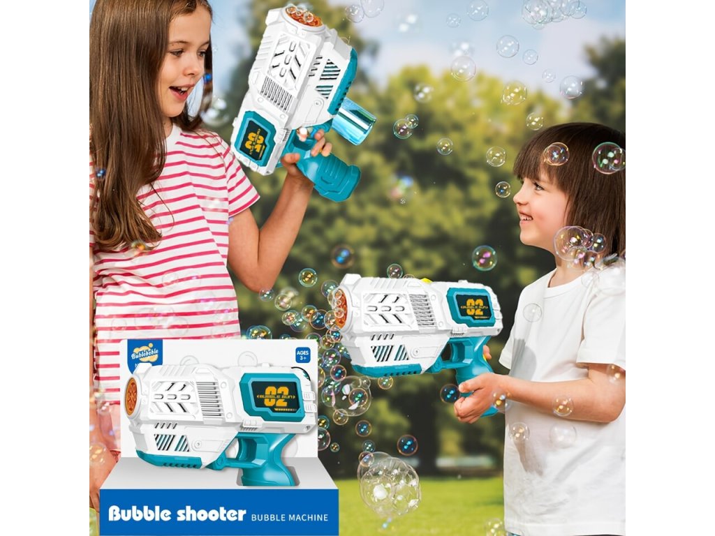 Bublifuk pištoľ 19,5 cmBublifuk s nádržkou 50 ml. Stláčaním spúšte sa tvoria bubliny. Napájanie na batérie 4x AA (nie sú súčasťou balenia)Rozmery pištole: 19,5 x 14 x 5,5 cm