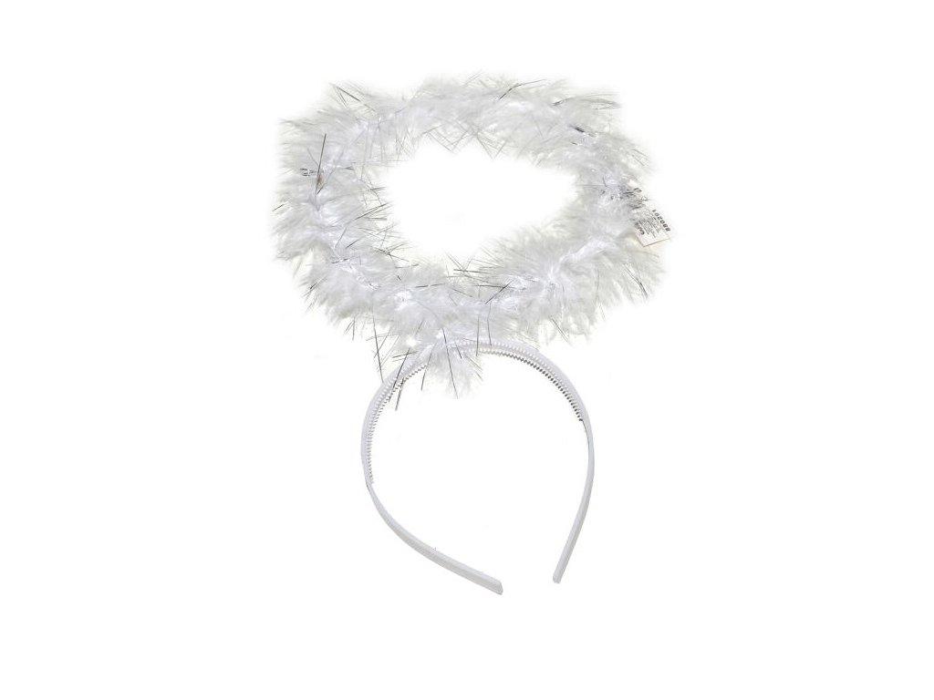 Anjelská svätožiaraS nežnou svätožiarou vás budú všetci považovať za anjela, aj keby vám z očí sršali blesky a spod sukienky vykukoval čertovský chvost. Anjelská svätožiara je vyrobená z jemného prachového peria, pripevnená k bielej pružnej čelenke nenápadným drôtikom.Odporúčaný vek: od 6 rokov