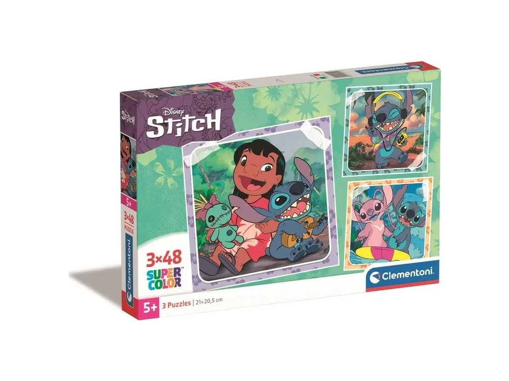 Clementoni Puzzle 3x48 StitchSada 3 puzzle (3×48 dielikov). Veselé, hravé motívy lákajú ku skladaniu; jasné farby uľahčujú triedenie. Dieliky sa dobre držia a hladko zapadajú – rozvíja sa jemná motorika aj sústredenie. Ostrá tlač a presný výsek. trénujú vizuálnu pamäťučí manuálnej zručnosti a trpezlivostirozmery : 21 x 20,5 cmodporúčaný vek: 5+
