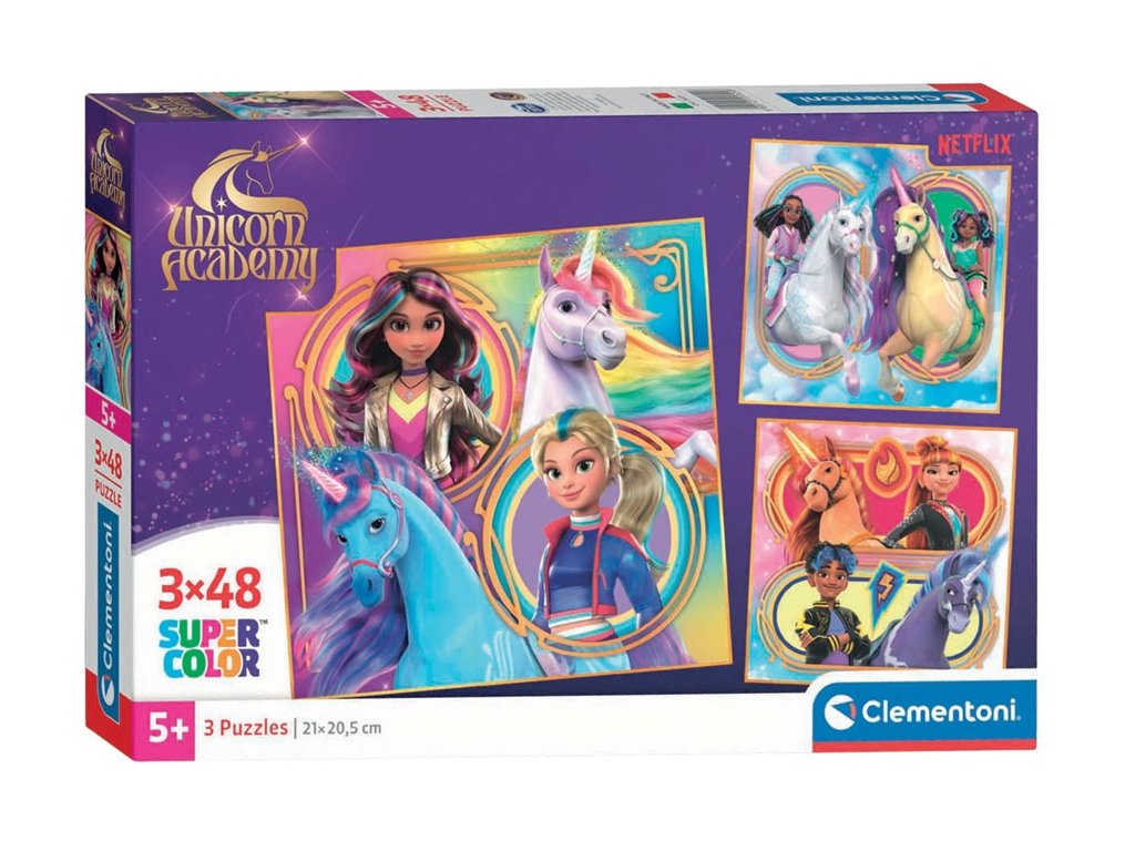 Clementoni Puzzle 3x48 Unicorn AcademySada 3 puzzle (3×48 dielikov). Veselé, hravé motívy lákajú ku skladaniu; jasné farby uľahčujú triedenie. Dieliky sa dobre držia a hladko zapadajú – rozvíja sa jemná motorika aj sústredenie. Ostrá tlač a presný výsek. trénujú vizuálnu pamäťučí manuálnej zručnosti a trpezlivostirozmery : 21 x 20,5 cmodporúčaný vek: 5+