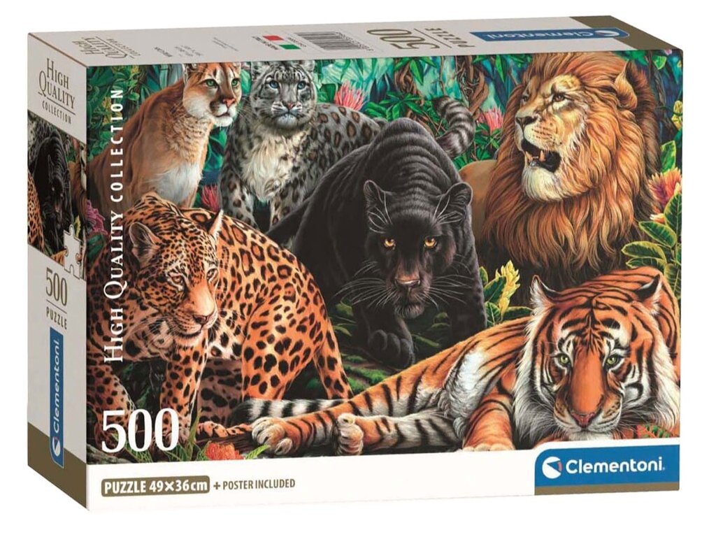 Clementoni Puzzle 500 Divoké šelmyObrázkové puzzle, ktoré si môžu deti poskladať z 500 dielov. Presnosť jednotlivých dielikov, optimálne rozlíšenie pri tlači a odolnosť materiálu potvrdzujú dlhoročnú kvalitu týchto výrobkov. trénujú vizuálnu pamäť, učí manuálnej zručnosti a trpezlivostiposkladaním puzzle vznikne obrázok s rozmermi: 48 x 36 cmplagát súčasťou baleniaPočet dielov: 500