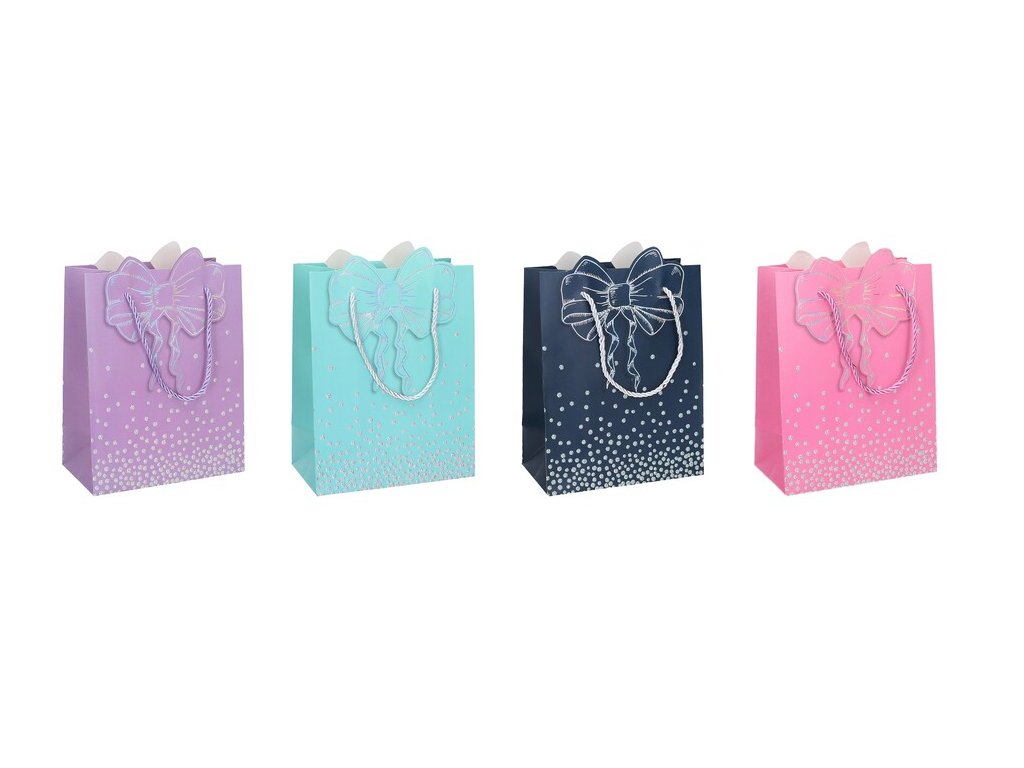 Darčeková taška Darčeková taška vyrobená z kvalitného tvrdého papiera s rôznymi motívmi, vhodná na jednoduché balenie suvenírov a darčekov. Rozmery : 18 x 23 x 10 cmFarby : zelená, ružová, fialová, čierna