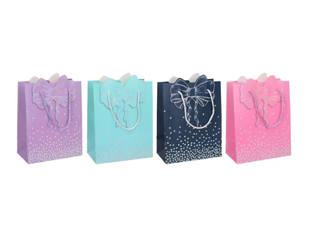 Darčeková taška Darčeková taška vyrobená z kvalitného tvrdého papiera s rôznymi motívmi, vhodná na jednoduché balenie suvenírov a darčekov. Rozmery : 41,5 x 12 x 30 cmFarby : ružová, fialová, modrá, čierna