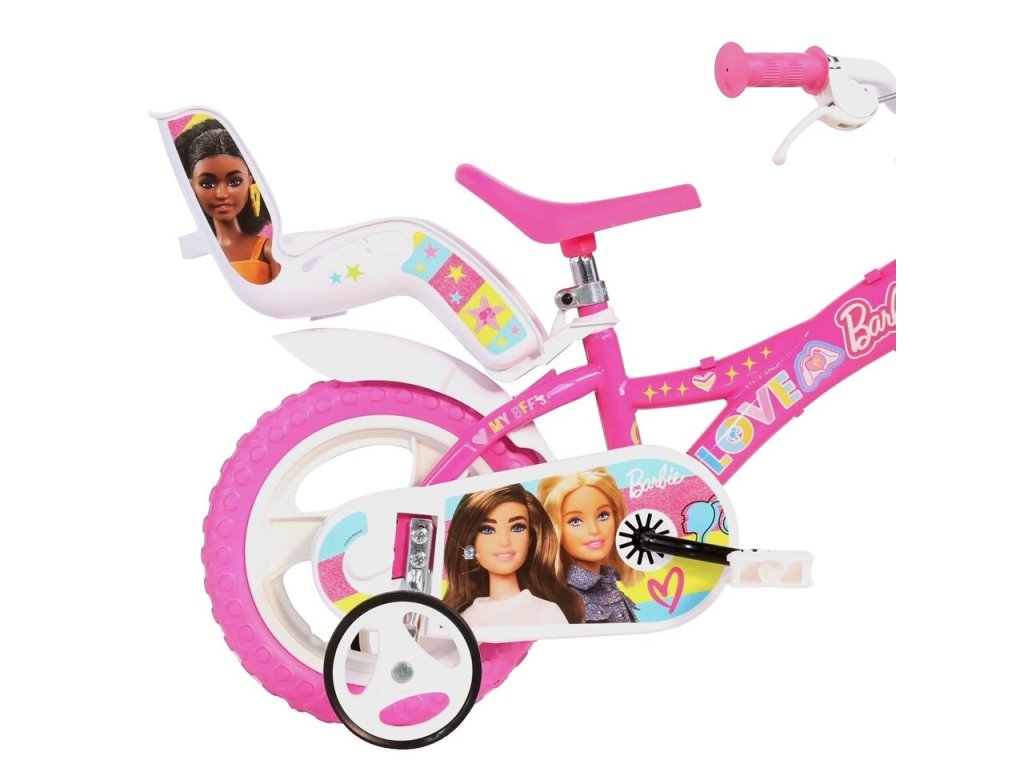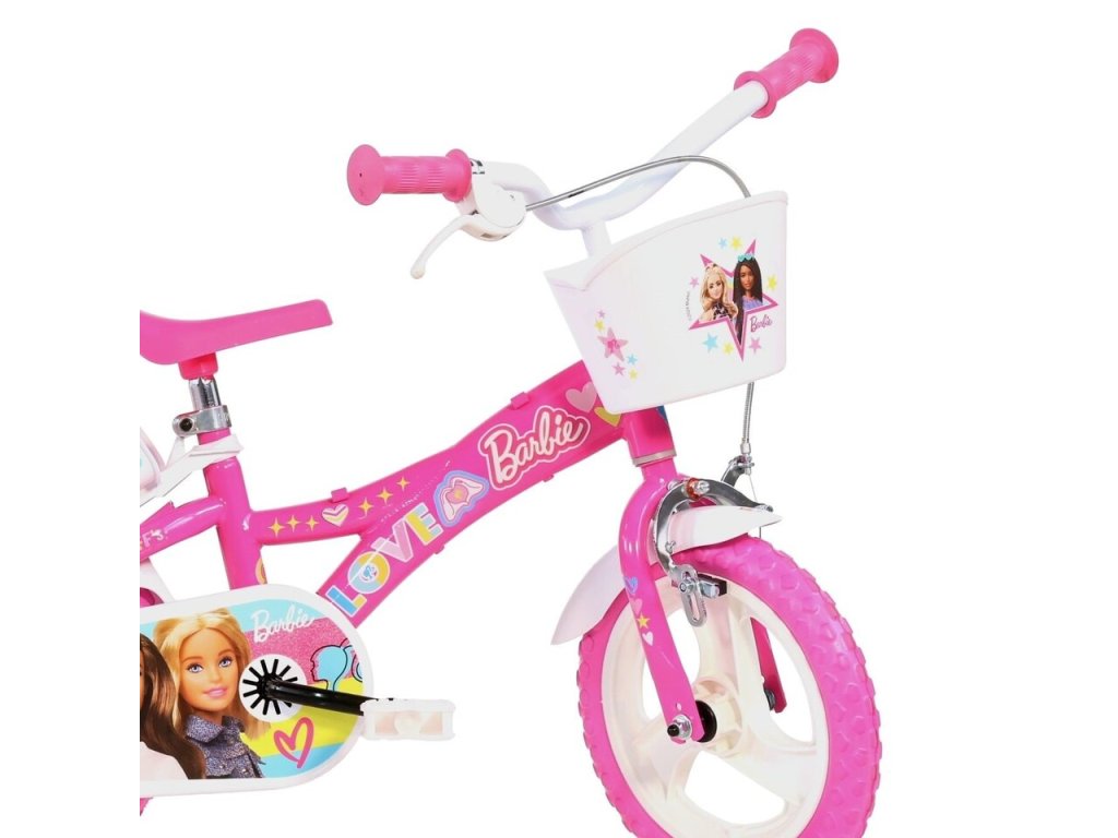 DINO Bikes - Detský bicykel 12" 612GL02BA - Barbie 2024Detský bicykel - 12" Dino 612GLBA s košíkom s licenciou Barbie, výrobca Dino Bikes Italy. Bicykel pre malé cyklistky. Kolesá majú plastový ráfik s plnou pneumatikou, čo vylučuje možnosť defektu a zároveň zjednodušuje údržbu, nakoľko netreba kolesá dohusťovať.Bicykel má 1 prednú čelusťovú brzdu.Stredové zloženie má stály prevod, tzv. "furtšlap".Bicyklík je vybavený pomocnými kolieskami a košíkom na riaditkách.S obrázkami a farbami s licenciou BarbieHmotnosť bicyklíka je 6,5 kg.Doporučená výška dieťaťa je 87-110 cm