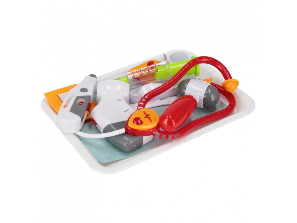 Doktorská sada S doktorskou sadou môžeš premeniť izbičku na lekársku ordináciu! Vďaka výbave môžeš určiť diagnózu pacienta a naordinovať správnu liečbu! Zahraj sa na doktora alebo doktorku. Hračka stimuluje detskú predstavivosť, učí sa starať o chorých, rozvíja detskú kreativitu. Sada obsahuje: tácku, stetoskop, striekačka, pinzeta, náplasť, nôž, lyžička, kladivo, pulzný oxymeter, teplomerMateriál: plastRozmer tácky: 18 x 24,5 cmVhodné od 3+
