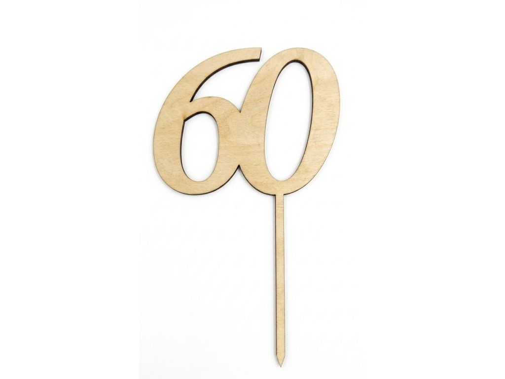 Drevený zápich na tortu s číslom "60" vyrobený z dreva