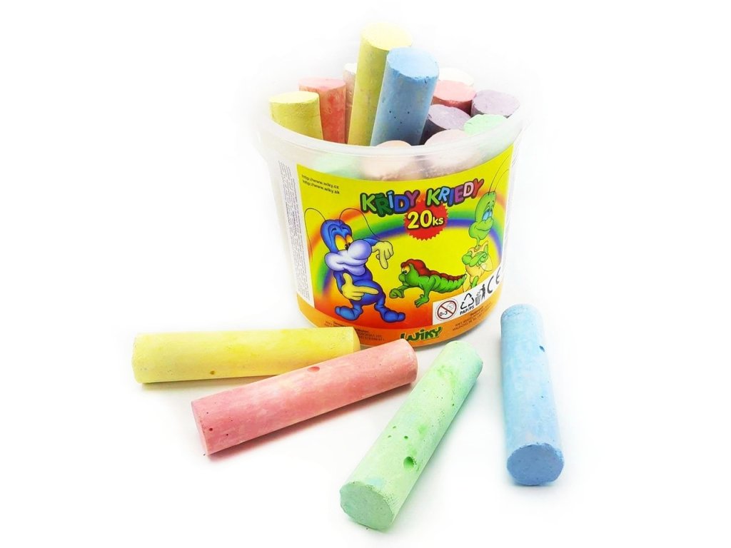 Farebné kriedy v plastovom kýbliku Kriedy majú guľatý tvar. Farby kried: červená, zelená, žltá, modrá, hnedá, biela, bordováVeľkosť kriedy: 10,5 x 2,5 cmBalenie: 20 ks