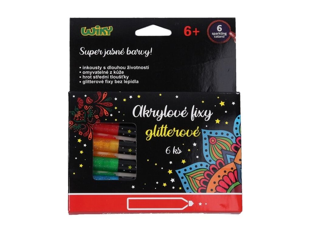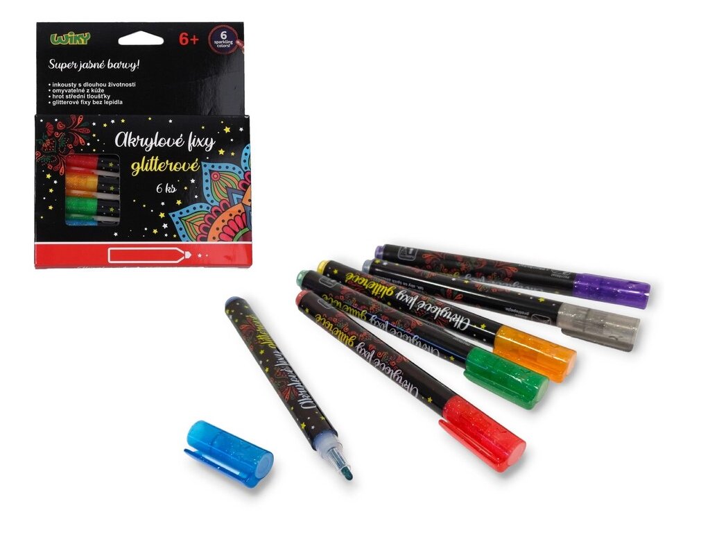 Fixky akrylové 6ksAkrylové fixy vhodné na rôzne povrchy: sklo, keramika, porcelán, drevo, kov, látka, plátno, kameň. 6 rôznych farieb v balení: sivá, modrá, zelená, žltá, červená, fialovánetoxickéguľatý hrotUV ochranadobre krytievhodné pre deti od 6+