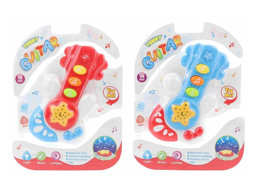 Gitara na batérie 15cm 2farbyPlastová gitara pre najmenších. Po stlačení tlačidiel svieti a vydáva zvuky. Napájanie na 2x AAA batérie (sú súčasťou balenia)Rozmery gitary cca 14 x 7,5 x 4 cmVek 18m+