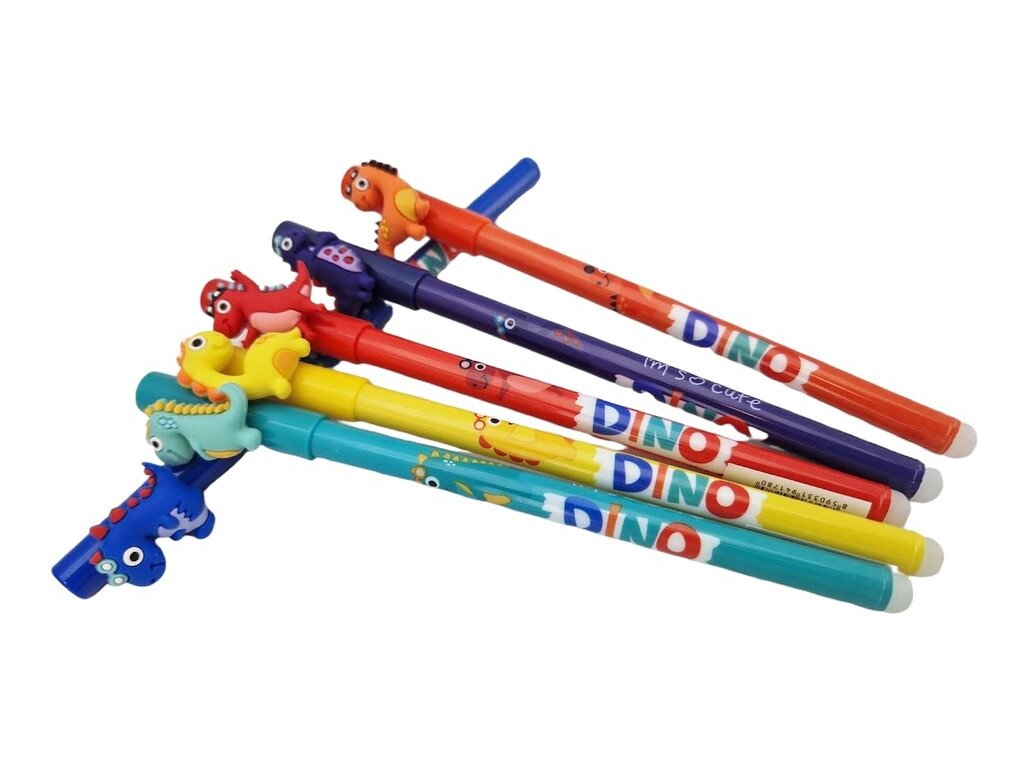 Gumovacie pero dinosaurus 0,5 mm, modráGélové prepisovateľné pero so špeciálnou náplňou, vďaka ktorej je možné písaný text vymazať pomocou plastového zakončenia pera a znovu prepisovať. 6 farieb s modrou tuhouMotívy: zelené, žlté, červené, bledomodré, oranžové, tmavomodrí V prípade balenia: 36 ksCena je uvedená za jeden ks pera