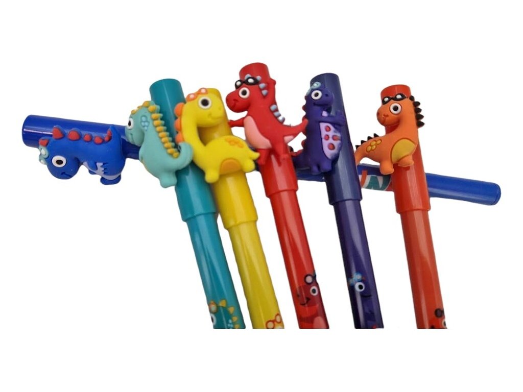 Gumovacie pero dinosaurus 0,5 mm, modráGélové prepisovateľné pero so špeciálnou náplňou, vďaka ktorej je možné písaný text vymazať pomocou plastového zakončenia pera a znovu prepisovať. 6 farieb s modrou tuhouMotívy: zelené, žlté, červené, modré, oranžové, fialové V prípade balenia: 36 ksCena je uvedená za jeden ks pera