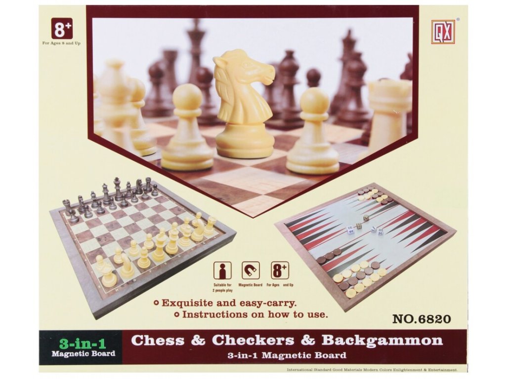 Hra šachy magnetické 3v1Spoločenská hra pre deti aj dospelých.Vlastnosti produktu: sada 3v1 s možnosťou hrania šachu, dámy alebo backgammonu, obsahuje dosku so základňou, s políčkami a figúrkami prispôsobenými týmto hrám, figúrky sú priťahované k doske vďaka svojim magnetickým vlastnostiam, ideálne na hranie vonku, pretože figúrky sa na hracej ploche nepohybujú vplyvom vetra, pri hre si deti rozvíjajú svoje intelektuálne schopnosti a logické myslenie, hra má pozitívny vplyv na rozvoj rozhodovacích schopností, strategického myslenia a situačnej analýzy.Rozmery produktu: 28 x 26 x 3 cmVek: 8+