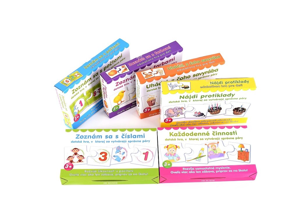 Hry naučné mixSpoločenské hry pre deti v ktorej sa vytvárajú správne páry majú veľmi jednoduché pravidlá. Rozvíjajú taktické myslenie, rozoznávanie farieb a priestorovú predstavivosť. Hrať sa môžu nie len deti, ale aj dospelí! Užite si spoločnú zábavu!Momentálne skladom:Zoznám sa s počtami (rozvíja znalosti počtov)Každodenné činnosti (naplánuj si svoj denný program) Nájdi protiklady (rozvíja vizuálne schopnosti párovania)Zoznám sa s mláďatami zvierat (rozvíja znalosti o prírode)Uhádni, kde bývajú (rozvíja znalosti o prírode)Zoznám sa s farbami (rozvíja znalosť farieb)Nájdi tieň (detská hra, v ktorej sa vytvárajú správne tvary)Uhádni, kto nám čo dáva (rozvíja logické schopnosti)Zoznám sa s číslami (rozvíja šikovnosť v počítaní)Zoznám sa s profesiami (rozvíja kombinačné schopnosti)Uhádni, kto čím sa živí (rozvíja znalosti o prírode)Uhádni zkde bývajú (rozvíja kombinačné schopnosti)Uhádni, z čoho sa vyrába (rozvíja kombinačné schopnosti)