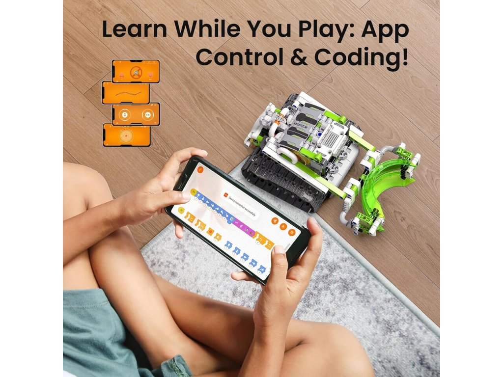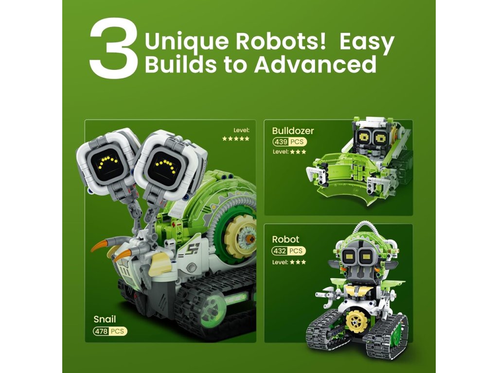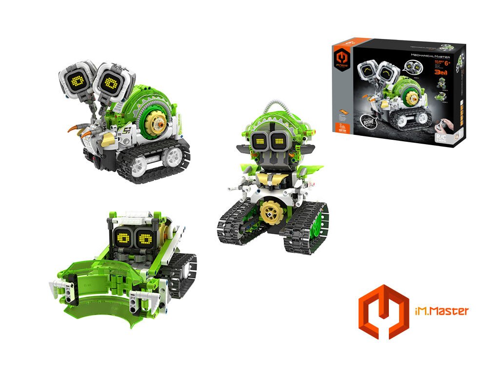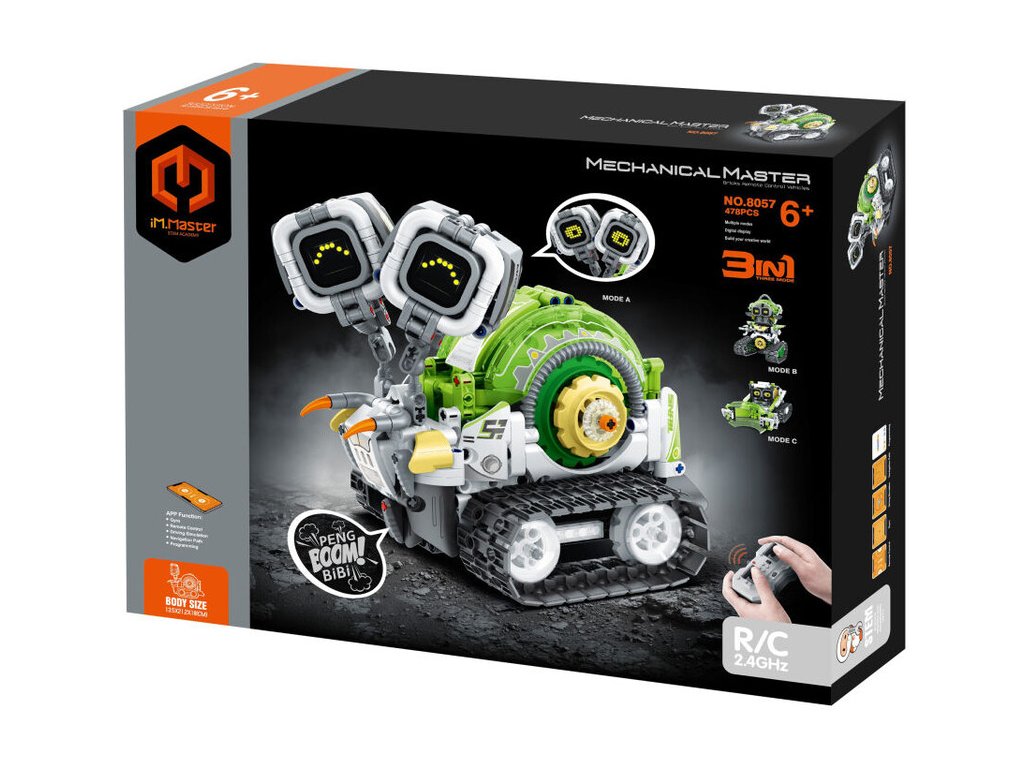 iM.Master 3-v-1 RC stavebnica robotický slimák 21 cmStavebnica iM.Master 3 v 1, ktorá umožňuje zostaviť troch rôznych robotov vrátane robota-slimáka a buldozéra. iM.Master 3-v-1 RC diaľkovo ovládaná stavebná sada. Rozmery: 13,5 x 21,2 x 18 cmObsahuje 478 dielovOvládanie pomocou diaľkového ovládača alebo smartfónuFrekvencia: 2,4 GHzBluetooth pripojenie k mobilnému telefónuAplikácia pre iOS a AndroidSvetelné a zvukové efektySúčasťou balenia je 300 mAh 7,4 V lítiová batéria pre robota2xAA batérie pre ovládač nie sú súčasťou baleniaUSB kábel je súčasťou baleniaVypínač ON/OFF na ovládači a batériovom boxe robota