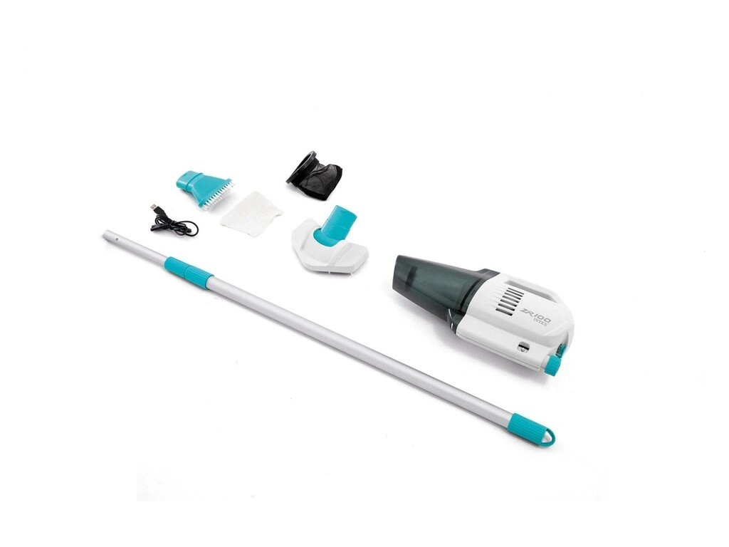 Intex 28626 akumulátorový vysávačAkumulátorový vysávač INTEX zaistí čistenie bez nutnosti pripojenia k filtračnému systému. Integrovaný nabíjací akumulátor. maximálna teplota vody 35°C!nezávislý systém čistenia bez nutnosti pripojenia k filtráciiteleskopická hliníková tyč cca 97 – 239 cmNabíjací USB kábel (adaptér nie je súčasťou balenia)4V 2Ah Ni-MH batéria, IPX8 vodotesnýplné nabitie trvá cca 5–6 hodín a potom funguje cca 40 až 50 minútdve vymeniteľné čistiace hubiceautomatické vypnutie vysávača pokiaľ nie je ponorený vo vodefiltračný vak na jemné nečistotymikrofilterNabíjací adaptér nie je súčasťou balenia (používajte iba vhodný USB zdroj s napätím 5–5,2 V DC, 1 A)