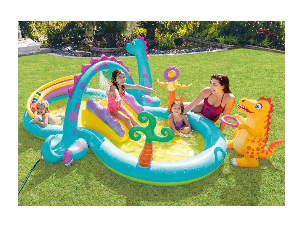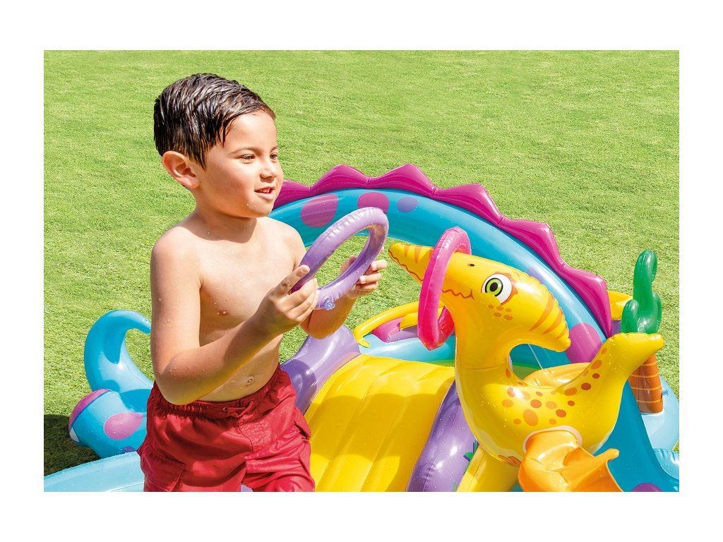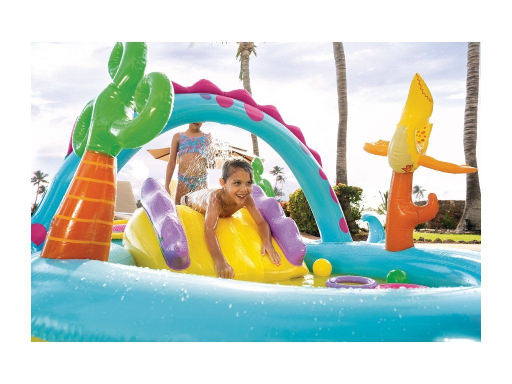 Intex 57135 Hracie centrum nafukovacie DinolandZábavné hracie centrum v dinosaurom dizajne so šmykľavkou osloví takmer každé dieťa. Veľký bazénik má extra široké steny a nafukovací oblúk s integrovanou vodnou spŕškou (s pripojením na záhradnú hadicu). Dodatočná ponuka zábavy pomocou priložených loptičiek a nafukovacích krúžkov. Rozmery 302 x 229 x 112 cmMaximálne zaťaženie 50KgVo výške plnenia 15 cm obsahu vody je objem 280 lVhodné pre deti od 3 rokov.