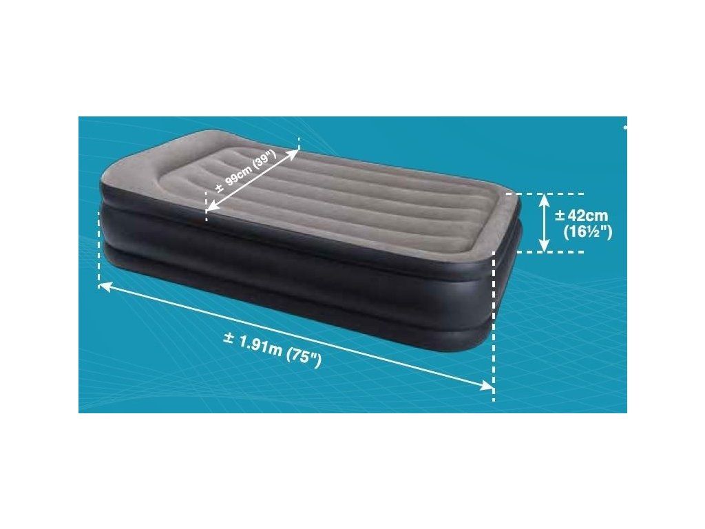 Intex 64132 Nafukovacia posteľ Deluxe Pillow Rest Raised Twin 230 V 191x99x42cmNeuveriteľný pokoj počas noci začína s jedinečným vláknom. Nafukovacie postele s touto novou, inovatívne a patentovanou technológiou Fiber-Tech sa skladajú z tisícov vysoko pevných polyesterových vlákien. Oproti bežným nafukovacím posteliam konštrukcie PVC I-Beam sa vysoko pevné polyesterové vlákna Fiber-Tech nerozťahujú. To vedie k úžasnej odolnosti a vylepšenému, dlhotrvajúcemu pohodliu. Moderná technológia Fiber-Tech Vám umožňuje absolútne príjemný a osviežujúci spánok. integrovaná elektrická vzduchová pumpatechnológia Fiber-Tech pre perfektný komfort pri ležanís overenou kvalitou, povločkovaná horná stranavinylová bočná stena a spodná stranakomfortná výška matraca 42 cmzabudovaný vankúš prináša príjemné pohodlie pri ležanímaximálna nosnosť 136 kgvrátane prenosnej tašky