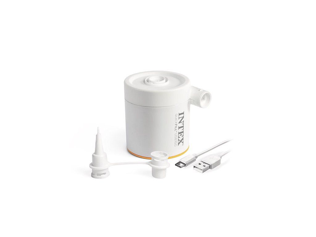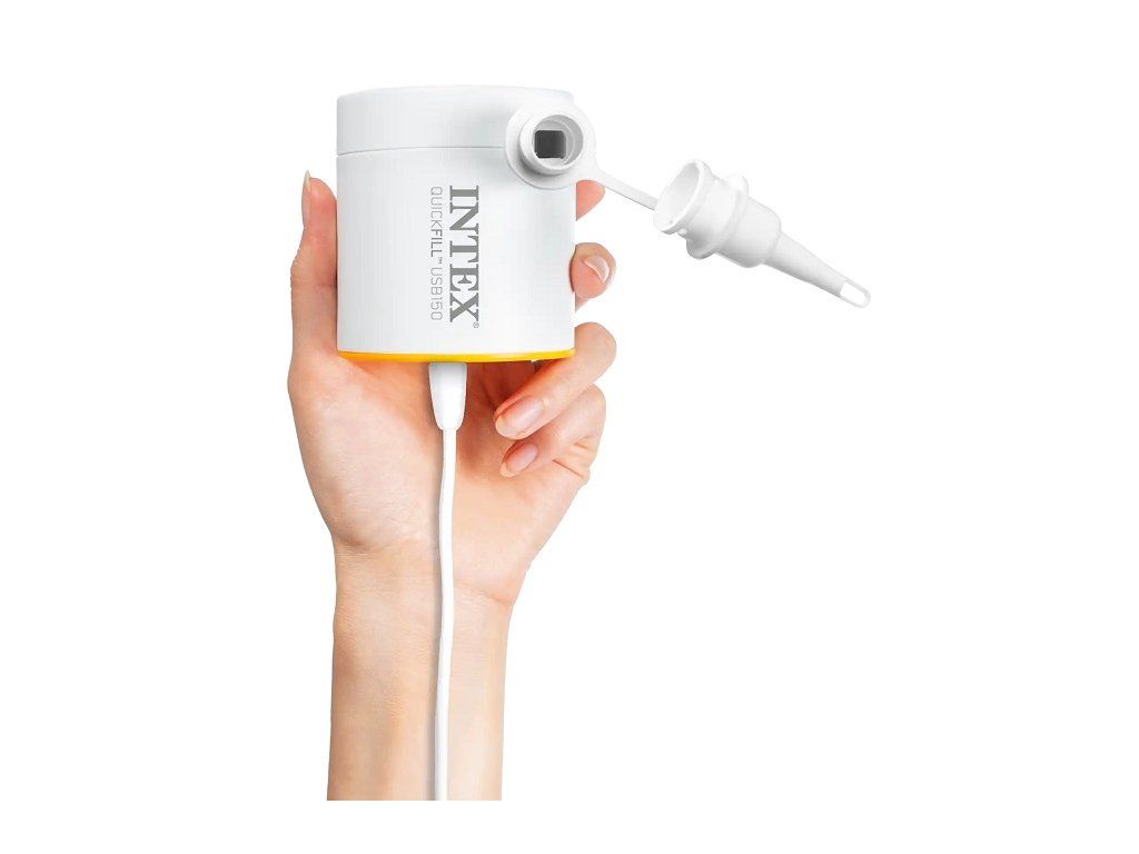 Intex 66616 Elektrická pumpa Quickfill USB150Elektrická pumpa Quickfill USB150 je napájaná 5 V zdrojom USB-A s menovitým prúdom 2 A a vyšším. Pumpa má dve funkcie: nafukovanie a vyfukovanie. Je ľahká a skladná, vhodná ako na domáce, tak aj vonkajšie použitie. Balenie obsahuje 2 vymeniteľné násadce kompatibilné s ventilmi rôznych nafukovacích produktov Intex. Rýchlosť prúdenia vzduchu v l/min: ≥ 150. Balenie obsahuje vrecko na uloženie pumpy. Prietok vzduchu max. 150l / minMax. tlak 3,0 KPaNapájanie pomocou kábla USB-A 5V, 2A+Nabíjačka nie je súčasťou balenia (používajte iba vhodný USB zdroj s napätím 5V DC, 2A+)Nafukovanie a vyfukovanieHmotnosť cca 3,5kg