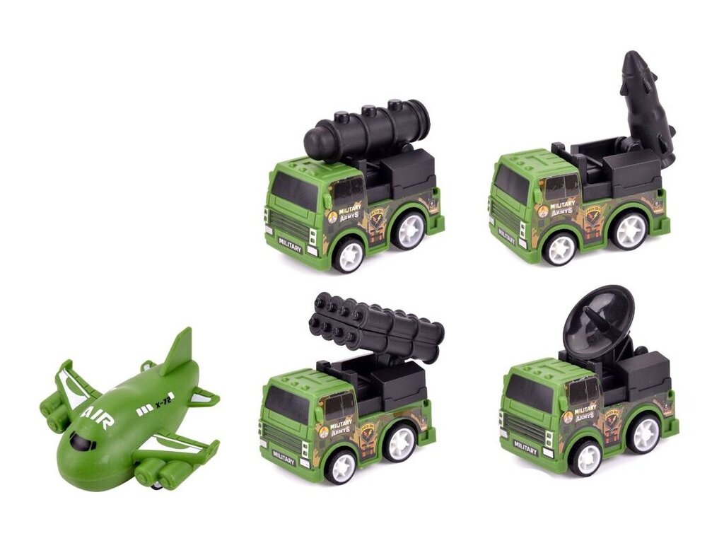 Mini vojenská technika 5,5 cmVojenské dopravné prostriedky 5 ks v balení. Autíčka a lietadielko sú na spätné natiahnutie. Počet ks: 5Veľkosť cca 5,5 cmVhodné od 3+