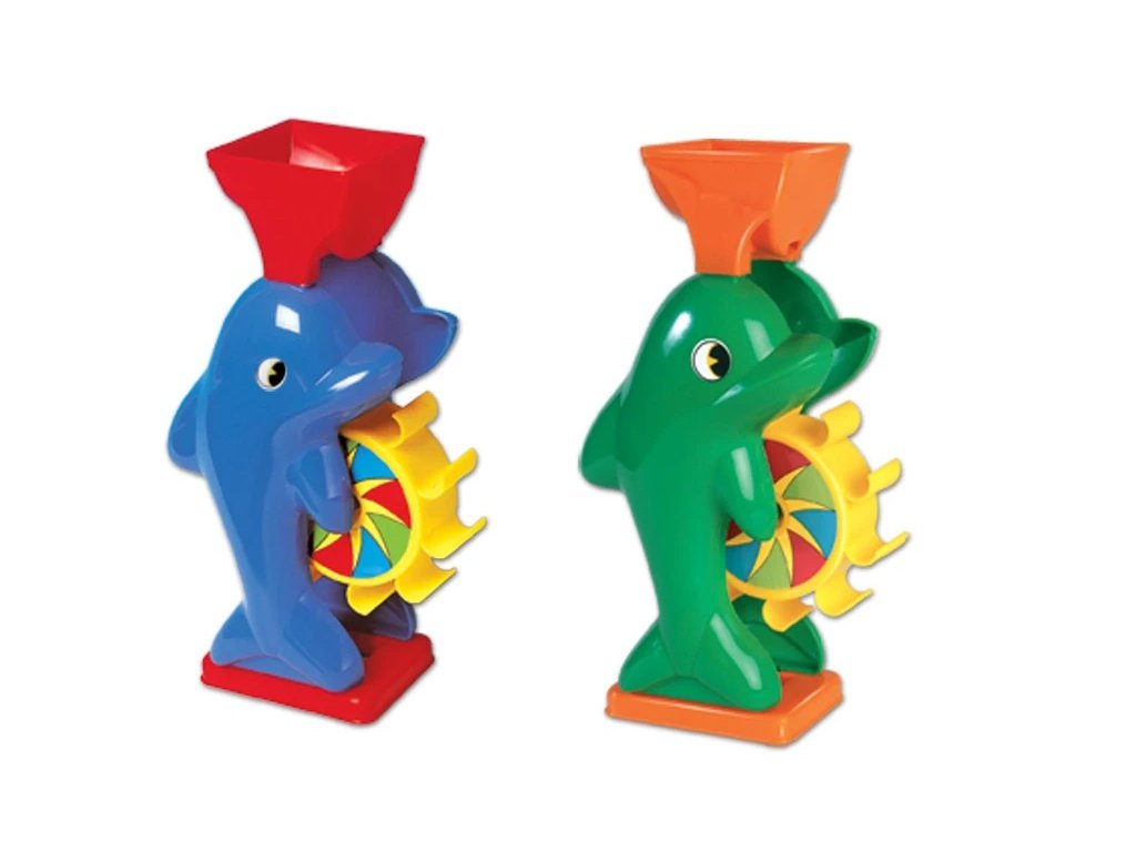 Mlynček do piesku Delfín 30cmMlynček na piesok a vodu s lopatkovými kolesami je vyrobený z kvalitného piesku. Nalej vodu alebo piesok do lievika a sleduj ako sa mlynčeky roztočia. Výška: 30 cm2 farby : zelená, modrá