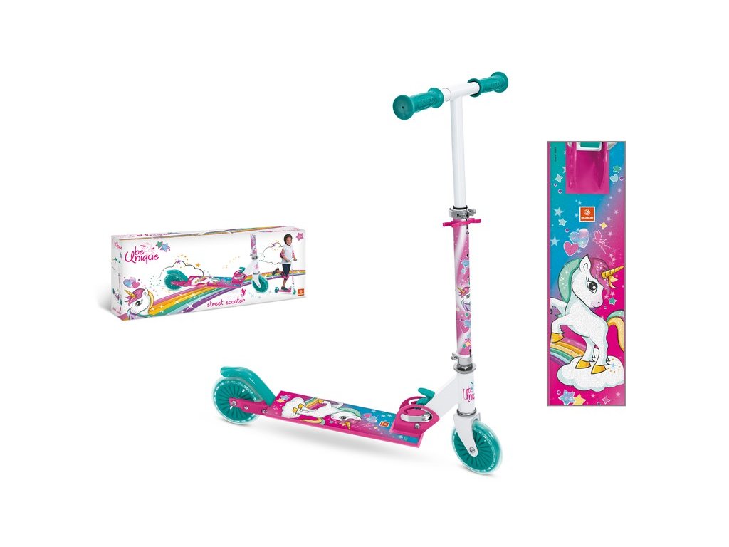 Mondo 28693 Kolobežka skladacia JednorožecKolobežka detská hliníková s potlačou Jednorožec. výrobcom je talianska firma Mondokolieska sú polyuretánové s priemerom 12 cm, ložiská sú ABEC-5zadný blatník slúži zároveň ako nášľapná brzda, riadidlá sú nastaviteľné do dvoch polôh výšky so zaistením štipce proti nechcenému uvoľneniunastaviteľná výška riadidiel od zeme je 56 až 86 cmnosnosť kolobežky: 50 kgrozmer stúpadla: 37 x 10 cmvek : 5+