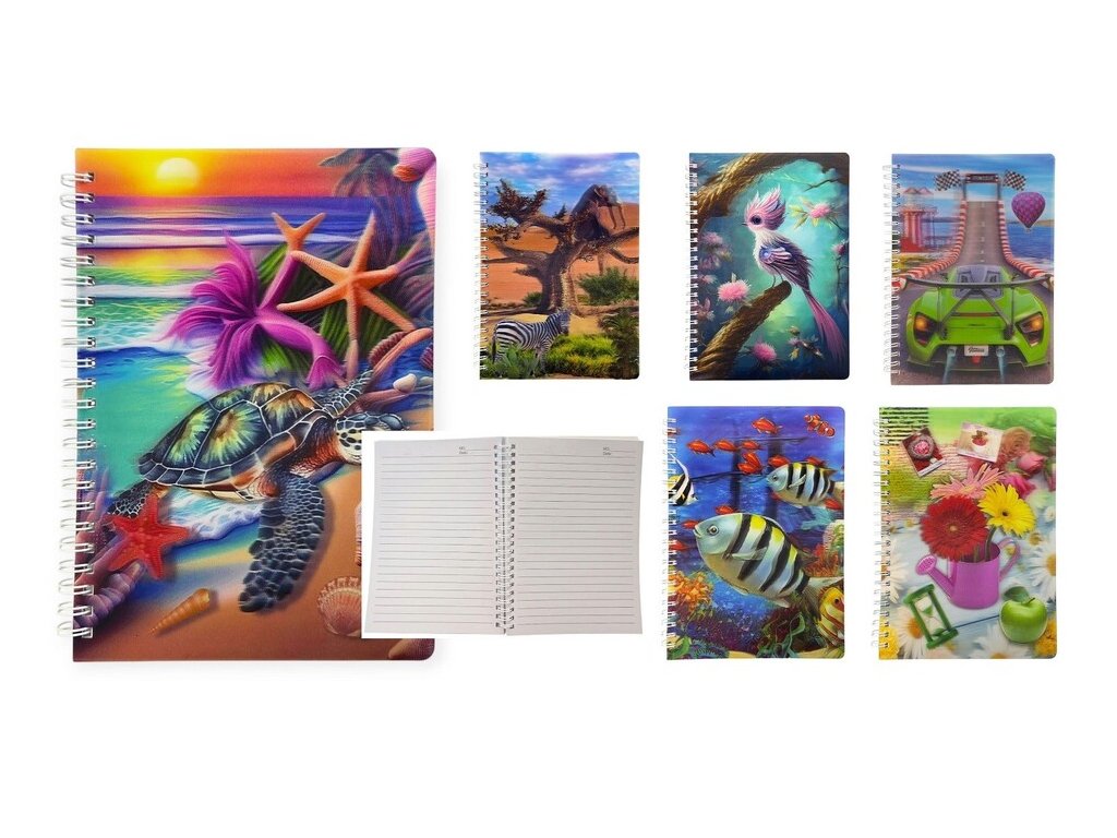 Notes špirála linajkovýObal s 3D efektom a rôznymi motívmi. 80 stránLinajkové strany, špirálová väzbaVeľkosť: 15 x 21 cmMotív: auto, ryba, korytnačka, vtáčik, zebra, kvetyUvedená cena je za 1ks