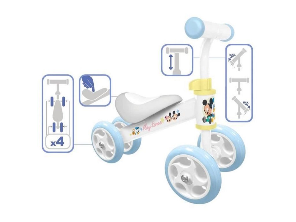 Odrážadlo bicykel Disney Play Time Mickey so 4 kolieskami JuniorObmedzené riadenie a štyri veľké kolesá zabezpečujú dobrú rovnováhu. Deti sa môžu naučiť riadiť bicykel a udržiavať rovnováhu. Tento balančný bicykel je ozdobený motívom Mickey & Friends na hranie, vďaka čomu je pre deti mimoriadne atraktívny. Materiál: oceľ/plast4 veľké kolieska z PVC pre väčšiu stabilitu.Výška sedadla a riadidiel nastaviteľnáGumové rúčky a pohodlné sedadloMaximálna hmotnosť: 20 kgOdporúčaný vek:od 18 mesiacov