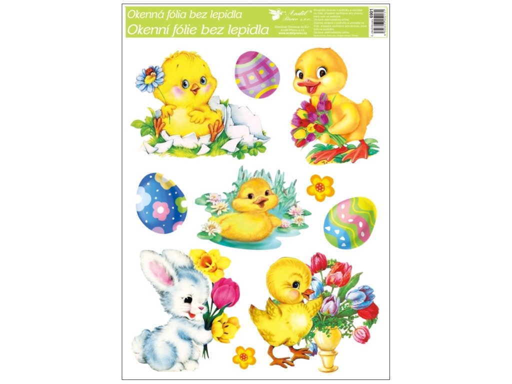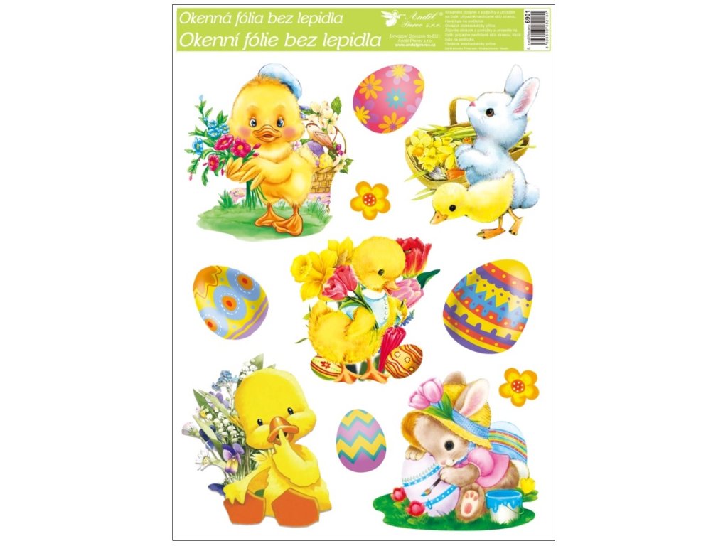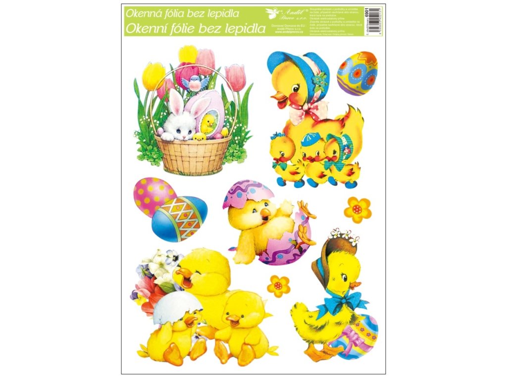 Okenná fólia veľkonočná 30x42 cmNaše okenné fólie neobsahujú lepidlo. Na plochu priľnú elektrostaticky a nezanechávajú tak po sebe žiadnu stopu. Vhodné sú akékoľvek hladké plochy, napríklad sklo, výklady, zrkadlá alebo kachličky. Čisté – bez lepidla – opakovane použiteľné.Použitie:Odporúčame pred použitím plochu očistiť od prachu a iných nečistôt.Fólia sa ľahko aplikuje sňatím z podkladového papiera a umiestením na hladkú plochu.Fóliu priložte a vyhľaďte prípadné bublinky rukou alebo suchou handričkou.Po použití je možné ich uložiť na pôvodný podkladový papier a uskladniť na ďalšiu sezónu.Rôzné motívy na výber. Zasielame náhodne podľa skladovej dostupnosti. Ak si želáte konkrétny motív napíšte do poznámky pri objednávke.