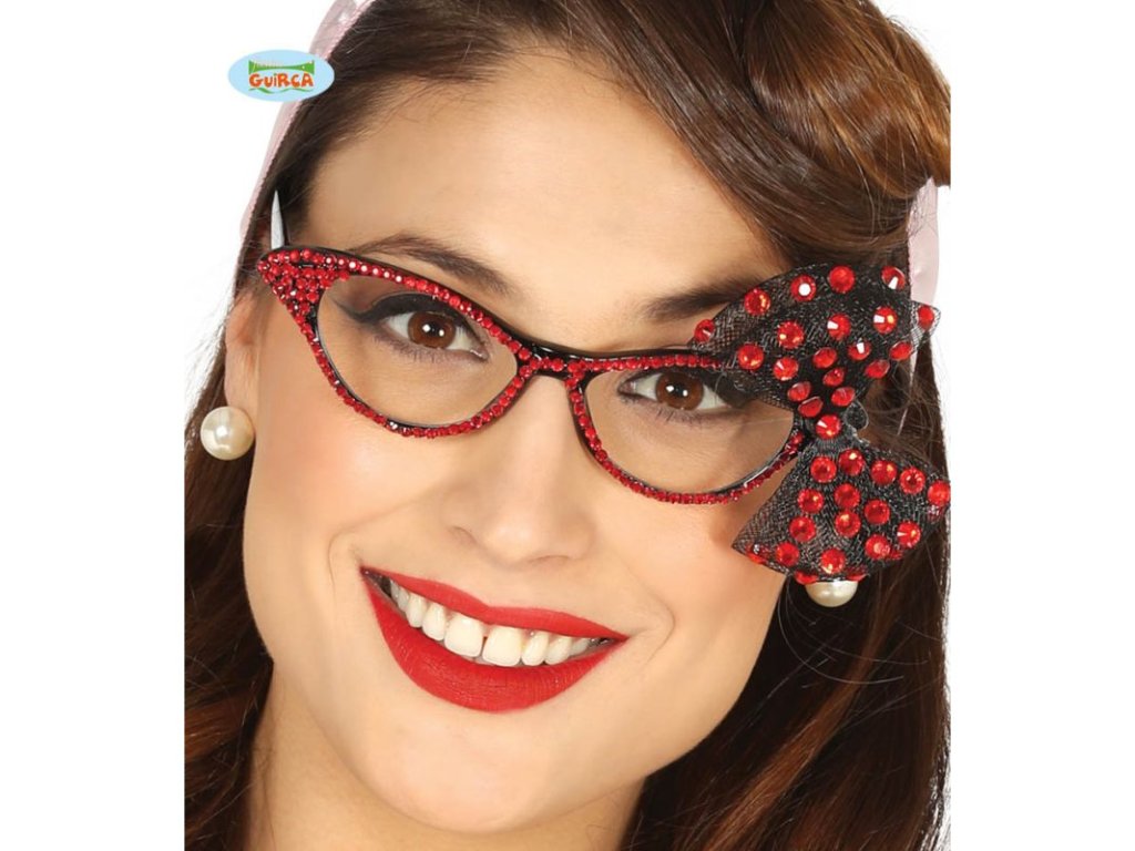 Okuliare sú vyrobené z plastu poiahnuté červenými kamienkami a čipkou