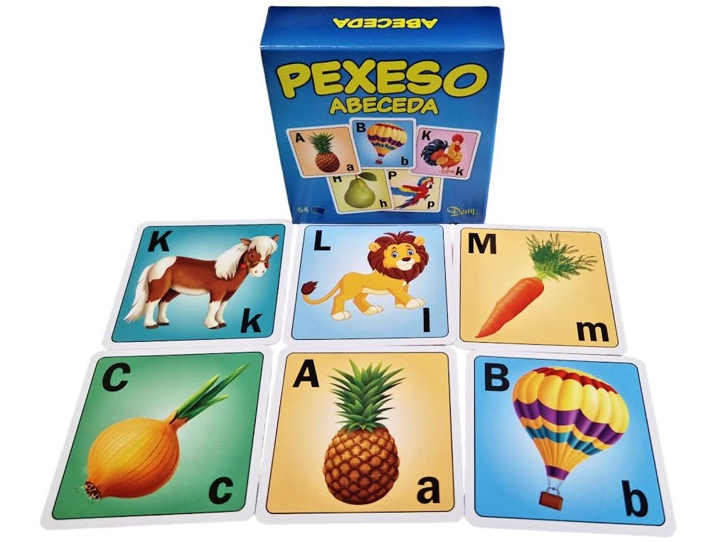 Pexeso abeceda 64 karietHra pre 2 až 4 hráčov so 64 kartami, ktoré tvoria 32 dvojíc s rovnakými obrázkami. Úlohou hráčov je hľadať dvojice kariet s rovnakými obrázkami. Hráči sa dohodnú na poradí, v ktorom budú vstupovať do hry. Všetky karty hráči rozložia na stôl obrázky dole. Hráč, ktorý je na rade, otočí dve ľubovoľné karty obrázky nahor tak, aby všetci spoluhráči tieto obrázky videli. V prípade, keď hráč otočí dve karty s rovnakými obrázkami, vezme si ich a otočí ďalšie dve karty. V prípade, keď hráč otočí dve karty s rôznymi obrázkami, karty si nevezme a otočí ich späť obrázkami dole. V hre pokračuje rovnakým spôsobom spoluhráč, ktorý je na rade. Hra končí vtedy, keď si hráči rozdelia všetky karty. Vyhrá hráč s najvyšším počtom dvojíc kariet. Veľkosť karty: 6,4 x 6,4 cmObsahuje 64 ks kartičiek