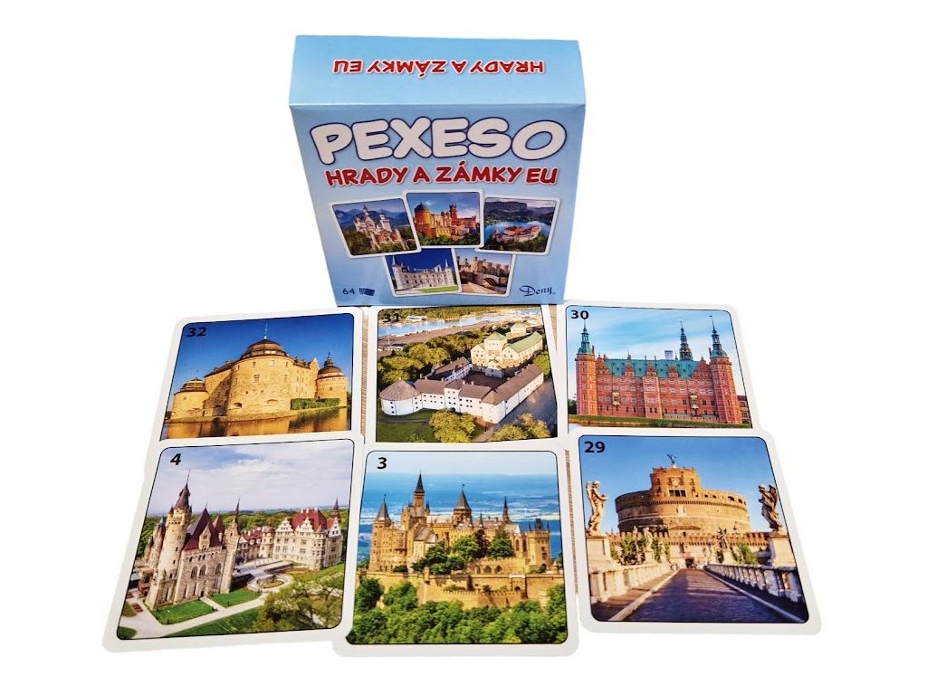 Pexeso hrady a zámky EUHra pre 2 až 4 hráčov so 64 kartami, ktoré tvoria 32 dvojíc s rovnakými obrázkami. Úlohou hráčov je hľadať dvojice kariet s rovnakými obrázkami. Hráči sa dohodnú na poradí, v ktorom budú vstupovať do hry. Všetky karty hráči rozložia na stôl obrázky dole. Hráč, ktorý je na rade, otočí dve ľubovoľné karty obrázky nahor tak, aby všetci spoluhráči tieto obrázky videli. V prípade, keď hráč otočí dve karty s rovnakými obrázkami, vezme si ich a otočí ďalšie dve karty. V prípade, keď hráč otočí dve karty s rôznymi obrázkami, karty si nevezme a otočí ich späť obrázkami dole. V hre pokračuje rovnakým spôsobom spoluhráč, ktorý je na rade. Hra končí vtedy, keď si hráči rozdelia všetky karty. Vyhrá hráč s najvyšším počtom dvojíc kariet. Veľkosť karty: 6,4 x 6,4 cmObsahuje 64 ks kartičiek