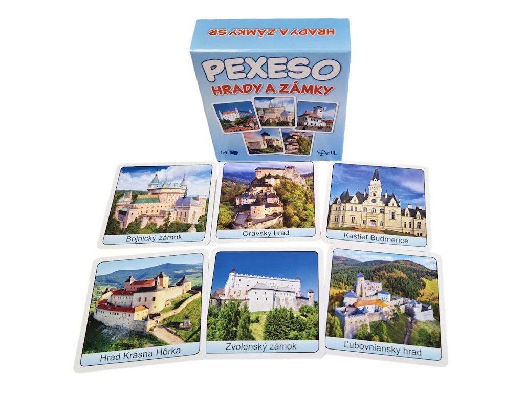 Pexeso hrady a zámky SKHra pre 2 až 4 hráčov so 64 kartami, ktoré tvoria 32 dvojíc s rovnakými obrázkami. Úlohou hráčov je hľadať dvojice kariet s rovnakými obrázkami. Hráči sa dohodnú na poradí, v ktorom budú vstupovať do hry. Všetky karty hráči rozložia na stôl obrázky dole. Hráč, ktorý je na rade, otočí dve ľubovoľné karty obrázky nahor tak, aby všetci spoluhráči tieto obrázky videli. V prípade, keď hráč otočí dve karty s rovnakými obrázkami, vezme si ich a otočí ďalšie dve karty. V prípade, keď hráč otočí dve karty s rôznymi obrázkami, karty si nevezme a otočí ich späť obrázkami dole. V hre pokračuje rovnakým spôsobom spoluhráč, ktorý je na rade. Hra končí vtedy, keď si hráči rozdelia všetky karty. Vyhrá hráč s najvyšším počtom dvojíc kariet. Veľkosť karty: 6,4 x 6,4 cmObsahuje 64 ks
