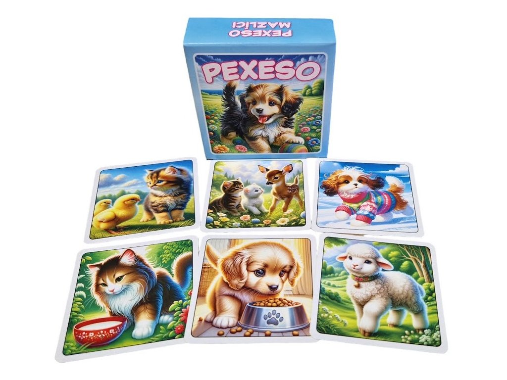 Pexeso maznáčikoviaHra pre 2 až 4 hráčov so 64 kartami, ktoré tvoria 32 dvojíc s rovnakými obrázkami. Úlohou hráčov je hľadať dvojice kariet s rovnakými obrázkami. Hráči sa dohodnú na poradí, v ktorom budú vstupovať do hry. Všetky karty hráči rozložia na stôl obrázky dole. Hráč, ktorý je na rade, otočí dve ľubovoľné karty obrázky nahor tak, aby všetci spoluhráči tieto obrázky videli. V prípade, keď hráč otočí dve karty s rovnakými obrázkami, vezme si ich a otočí ďalšie dve karty. V prípade, keď hráč otočí dve karty s rôznymi obrázkami, karty si nevezme a otočí ich späť obrázkami dole. V hre pokračuje rovnakým spôsobom spoluhráč, ktorý je na rade. Hra končí vtedy, keď si hráči rozdelia všetky karty. Vyhrá hráč s najvyšším počtom dvojíc kariet. Veľkosť karty: 6,4 x 6,4 cmObsahuje 64 ks kartičiek