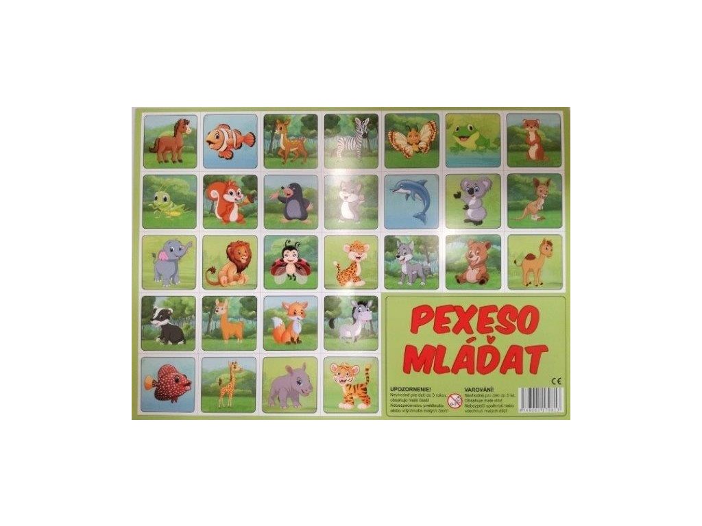 Pexeso mláďatPexeso je jednou z najznámejších a najobľúbenejších detských hier. Deti si pri hre precvičujú pamäť, postreh, farby, učia sa trpezlivosti a hre v kolektíve. Pexeso obsahuje 32 dvojíc s rovnakými obrázkami, hra je určená pre 2-4 hráčov. Veľkosť kartičiek: 4,9 x 4,9 cm