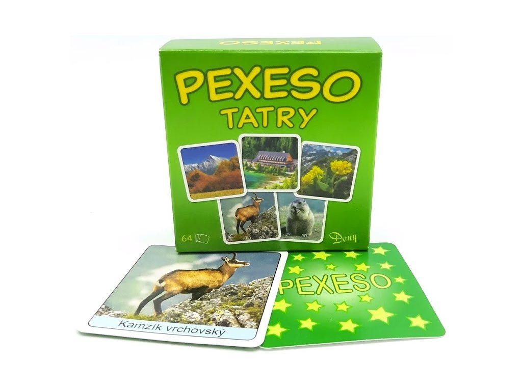 Pexeso TatryPexeso je jednou z najznámejších a najobľúbenejších detských hier. Deti si pri hre precvičujú pamäť, postreh, farby, učia sa trpezlivosti a hre v kolektíve.Pexeso obsahuje 32 dvojíc s rovnakými obrázkami, hra je určená pre 2-4 hráčov. Veľkosť karty: 6,4 x 6,4 cm
