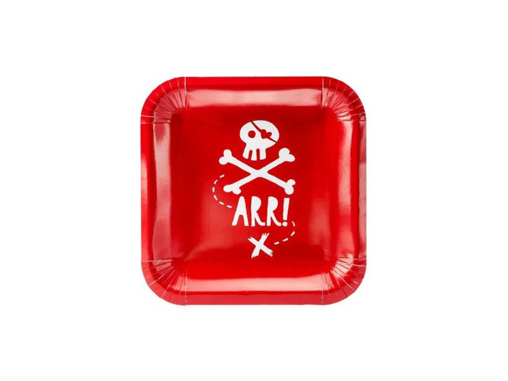 Červené papierové taniere Piráti s bielou potlačou, rozmery cca 20 x 20 cm.