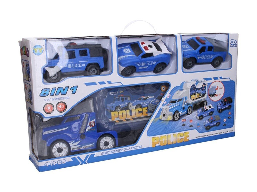Policajný kamión s 3 autami skrutkovacie, s efektmiPolicajné odpojiteľné hračky (Detachable Toy Series). Ide o policajné nákladné auto, ktoré sa dá rozložiť, a obsahuje 6 menších autíčok, skrutkovateľné, s efektmi. Svetelné a zvukové efekty. 3xAG13 batérie sú súčasťou balenia. Voľné kolesá. Obsahuje auto, kufrík, 3 autá, skrutkovač, 5 značiek. Vypínač ON/OFF na spodnej strane auta. Veľké nákladné auto má svetelné a zvukové efekty, ktoré sa aktivujú stlačením červeného tlačidla na kabíneRozmery veľkého auta sú približne 42 x 9 x 20 cm, zatiaľ čo malé autíčka majú veľkosť 7-8 cmHračka je vhodná pre deti od 3 rokov