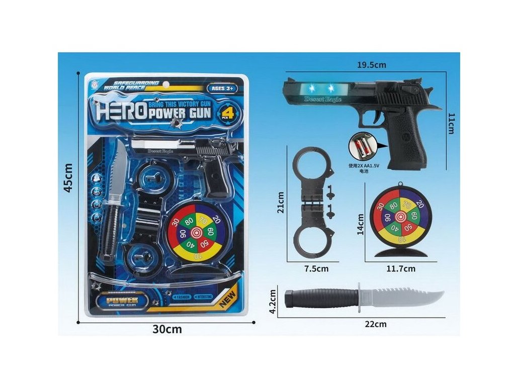 Policajný set s efektmiSkvelá sada, ktorá obsahuje všetko potrebné pre malého začínajúceho policajta. Veľkosť pištole 20 cm, noža 22 cmPištoľ so svetelnými a zvukovými efektmiBalenie obsahuje pištoľ, nôž, putá, terčOdporúčaný vek: od 3 rokov3 x AA batérie nie sú súčasťou